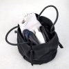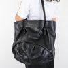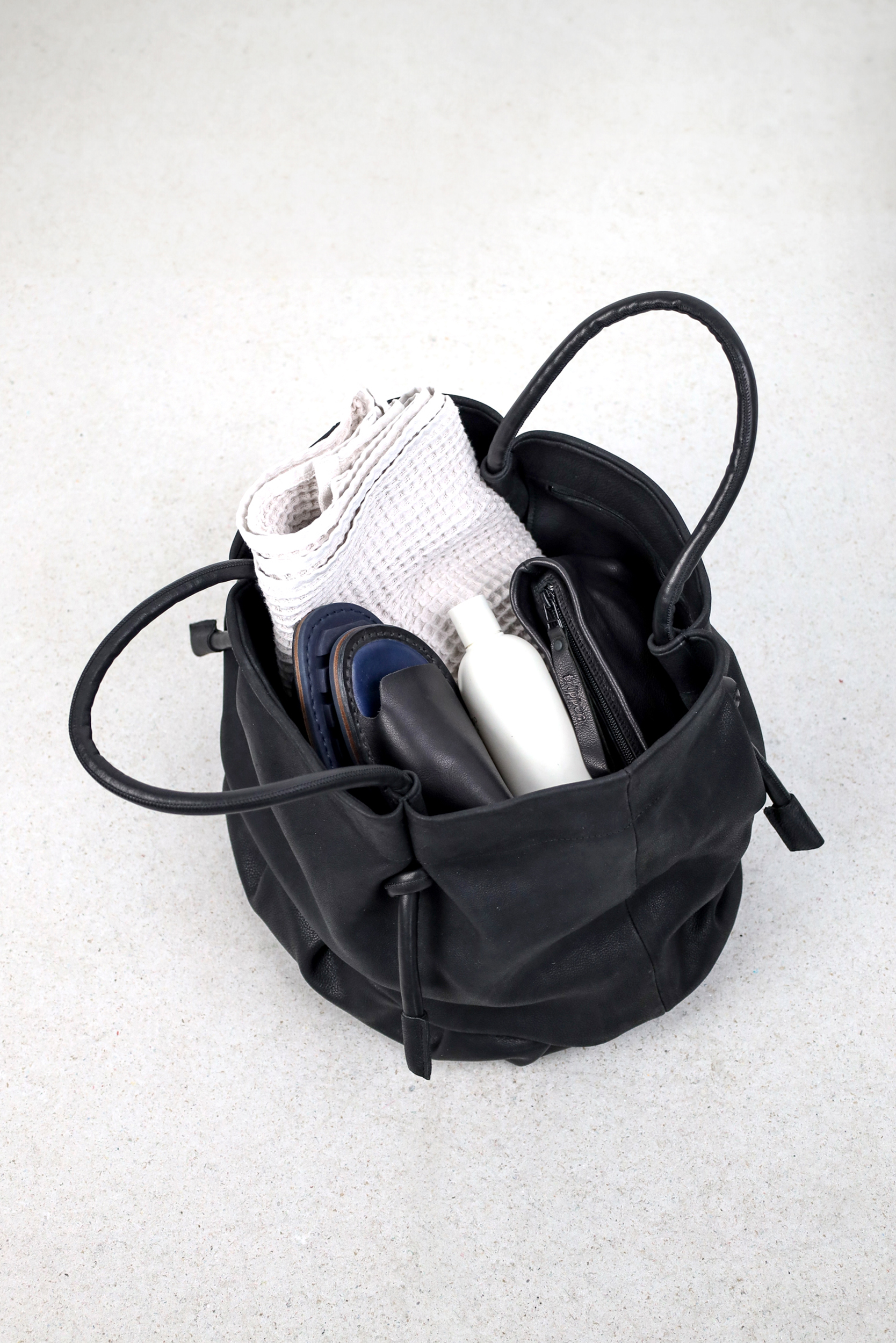 This spacious beach bag can be carried as shoulder- or hand-bag thanks to the comfortable padded and adjustable handles. The displaced round bottom, enriched with folds, allows for extra volume.