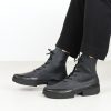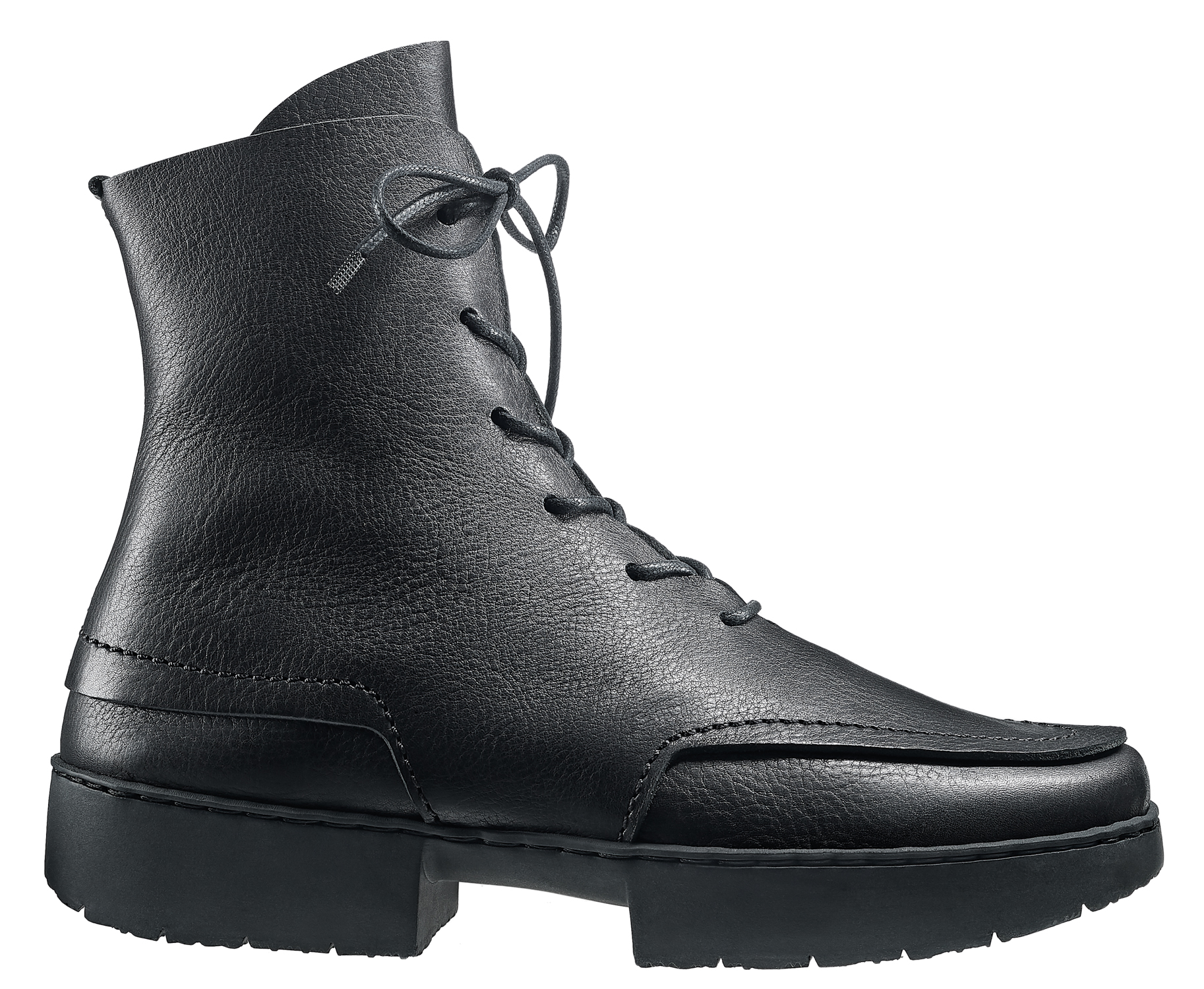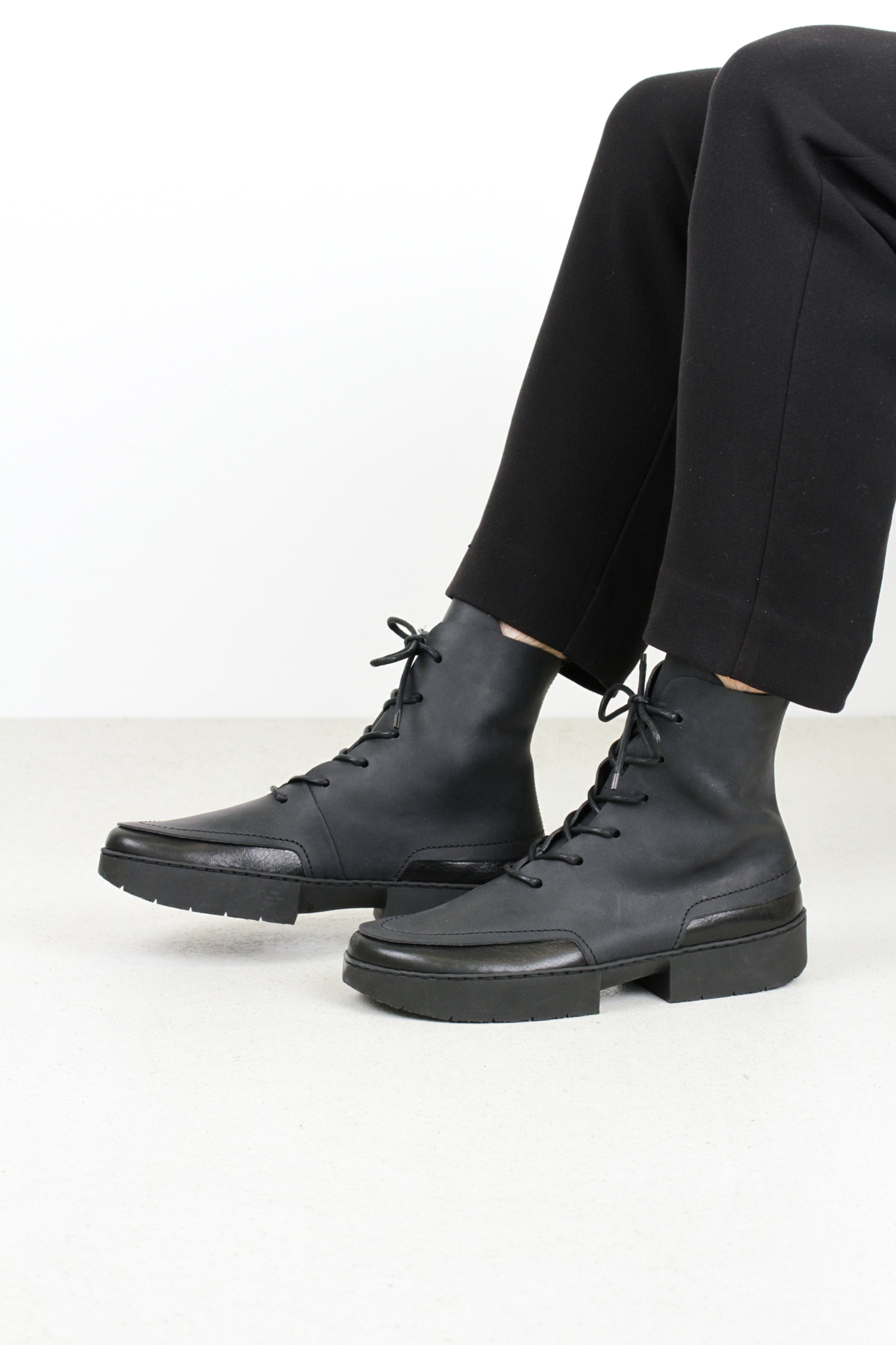 Unisex lace-up boot with interleaved design and top-stitching, framing the interplay of the outer layer.
