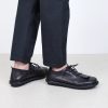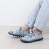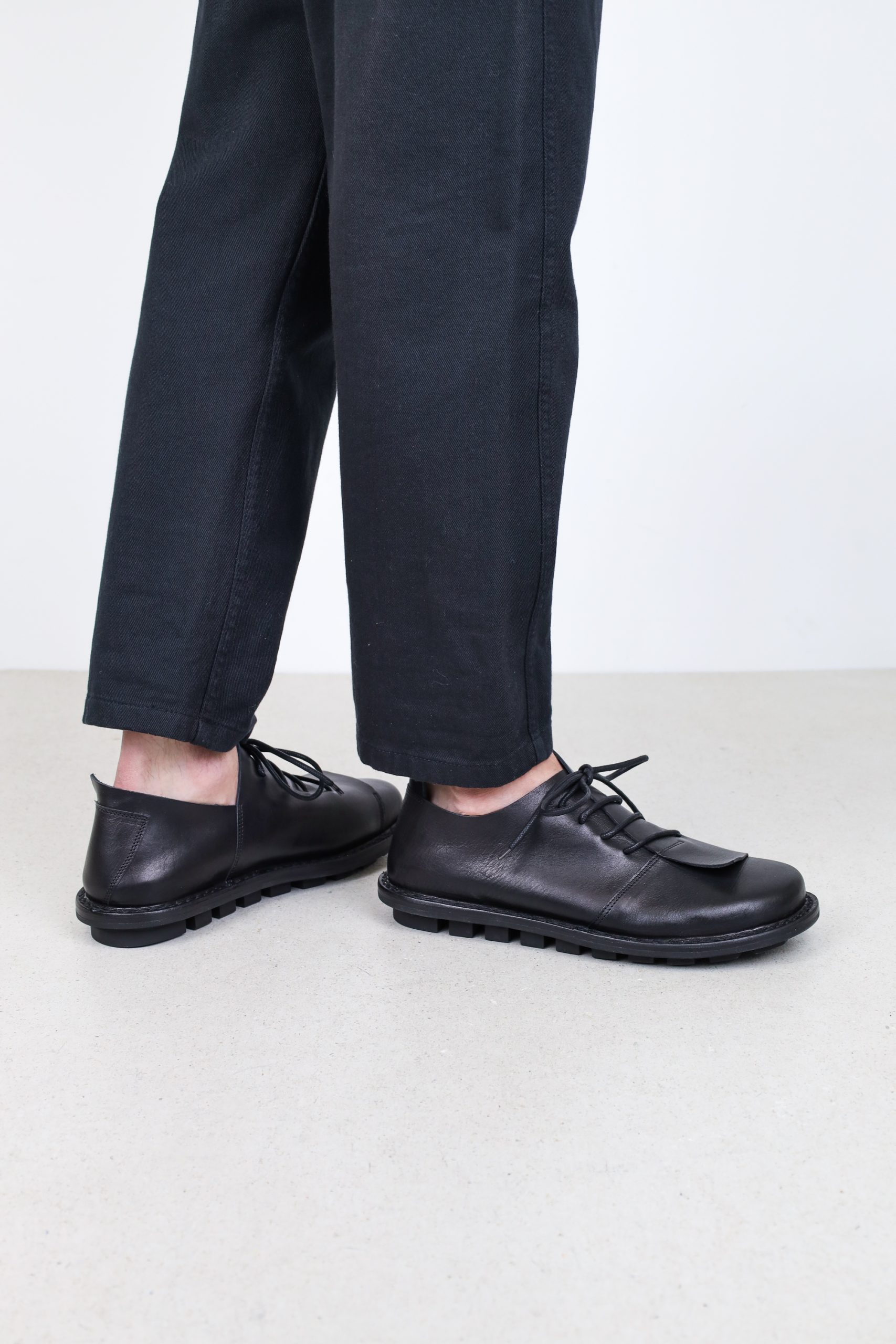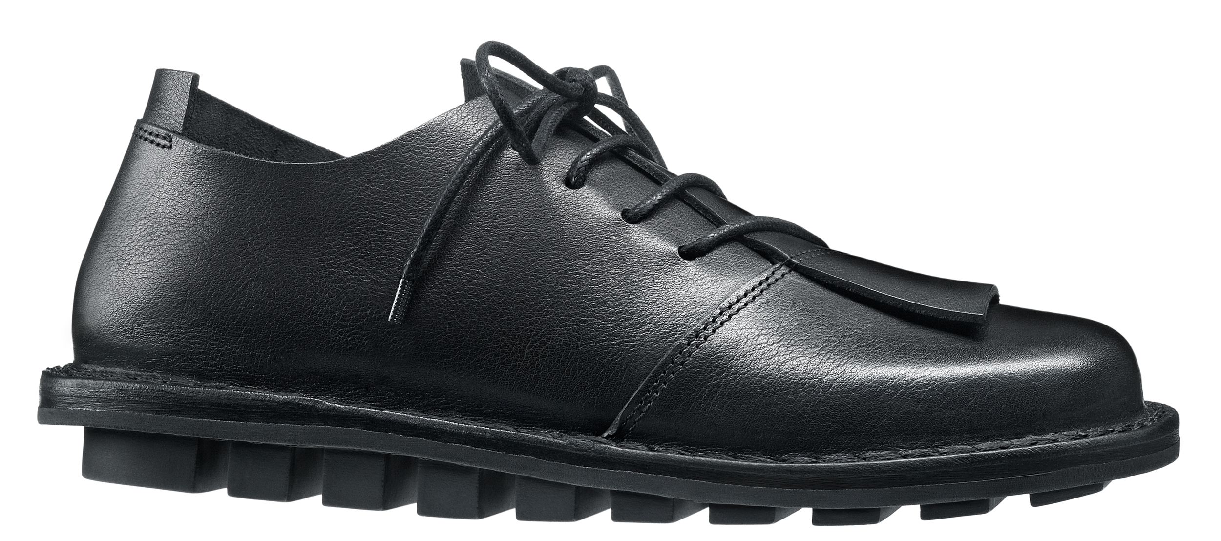 The deconstructed sections of this low shoe are held together by a fanned-out lacing.
