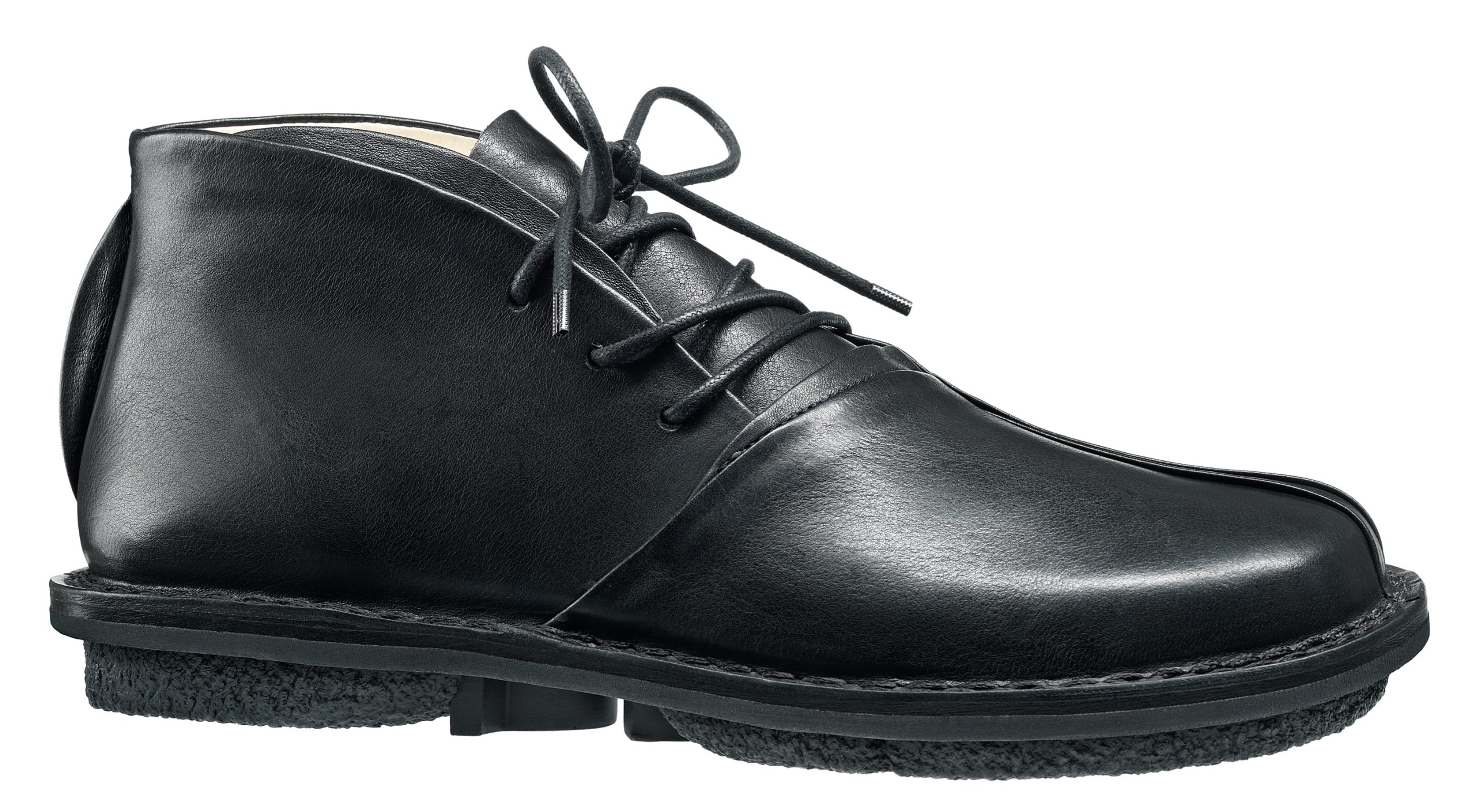 Finely sewn, organically curved sections overlaying classic intersecting lines define this asymmetrical men’s lace-up’s elegant aesthetic.
