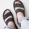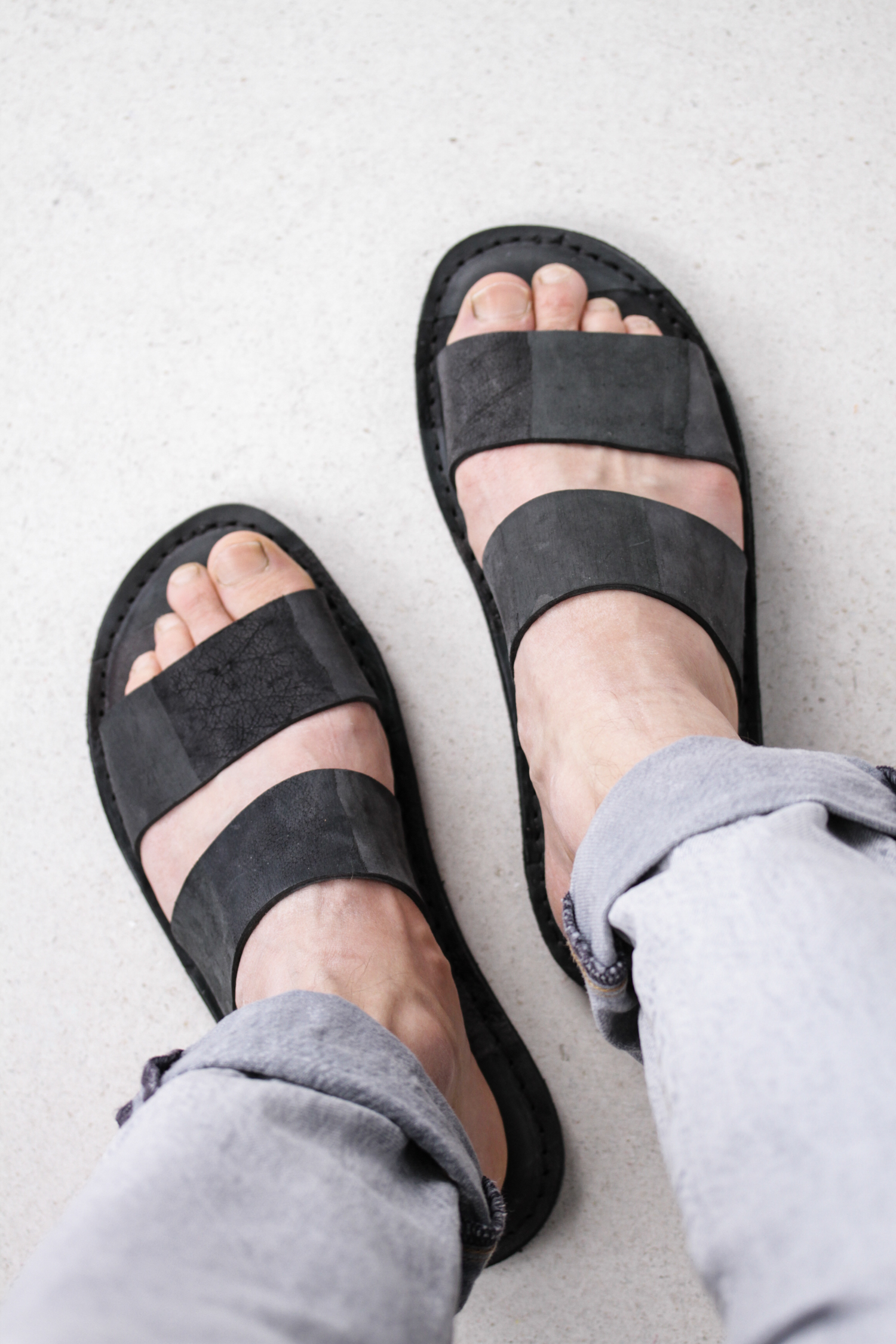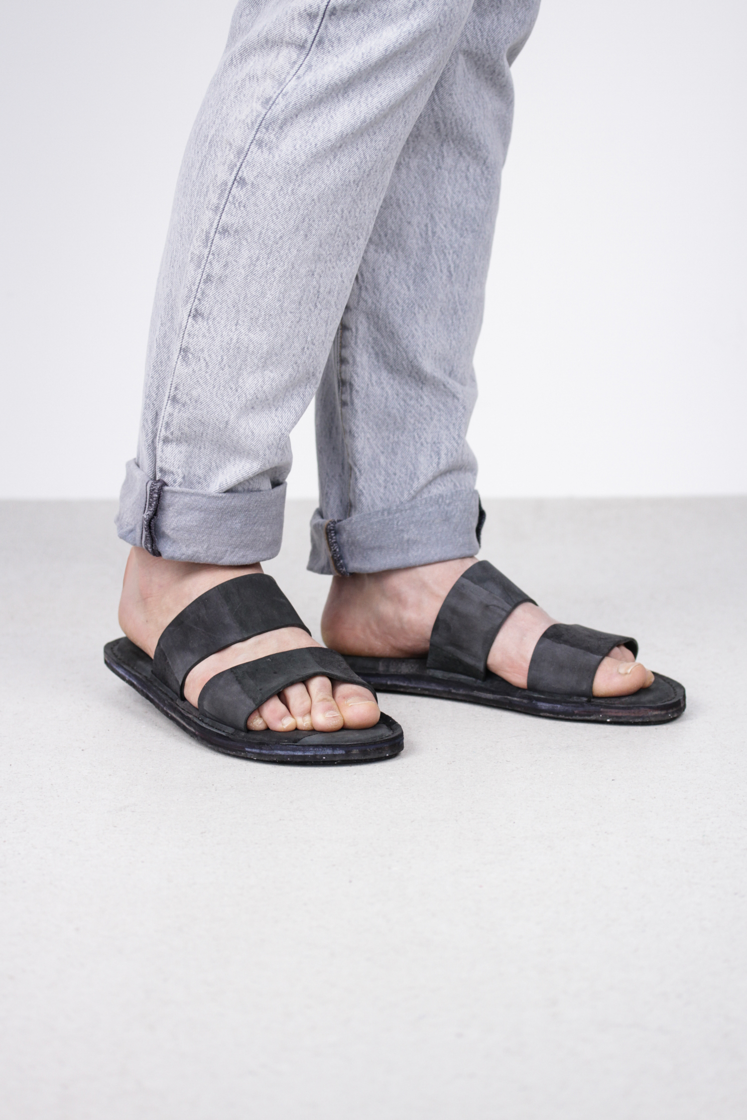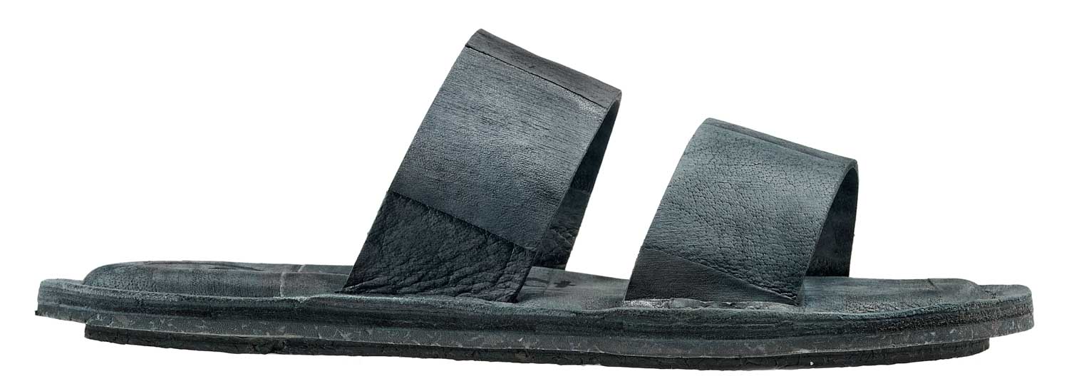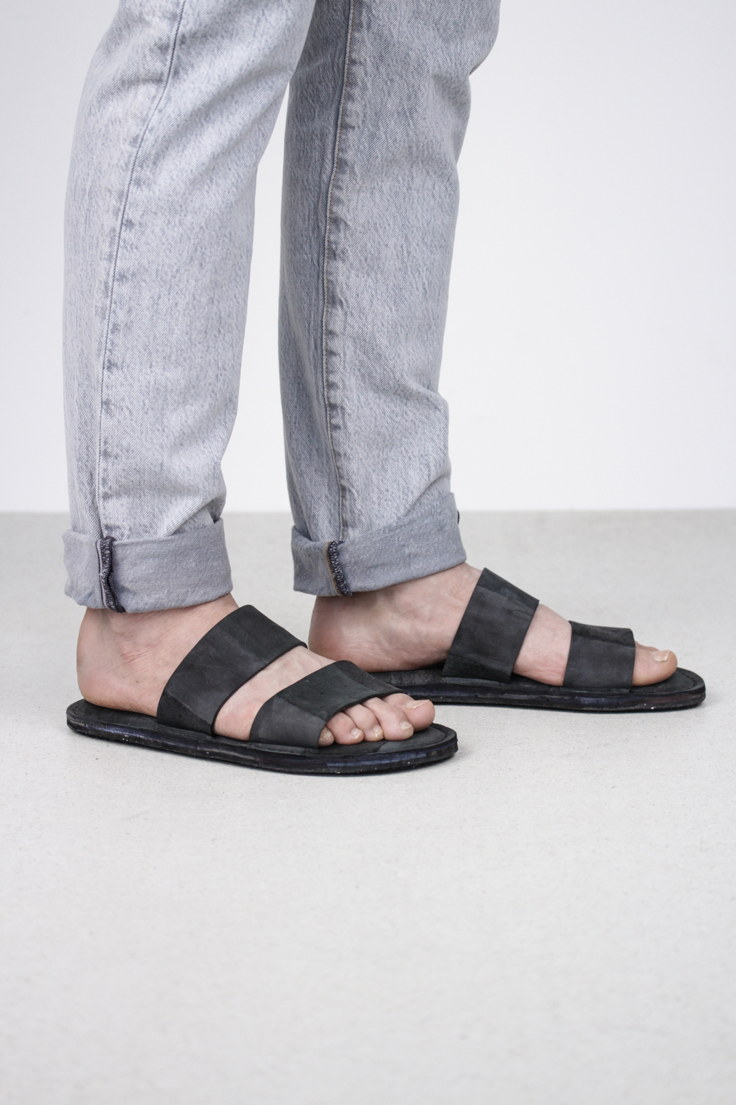 Naturally shaped sandal featuring an upper and midsole made from leather punching scraps, a felt insole made from recycled plastic bottles and a sole created from a granular mixture of our rejected and repaired soles.