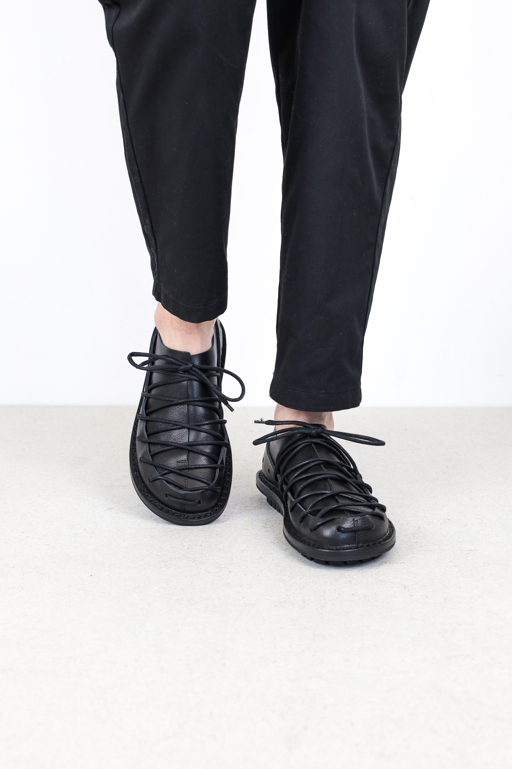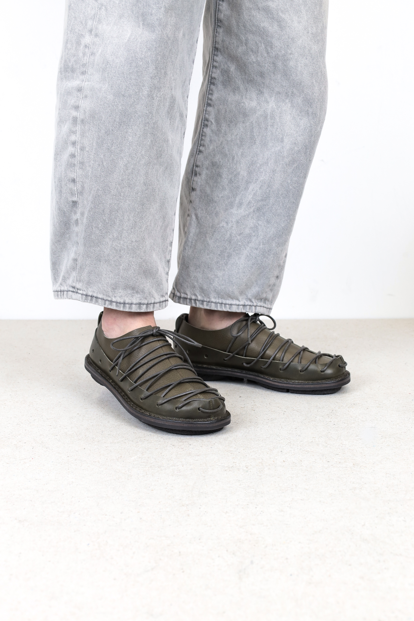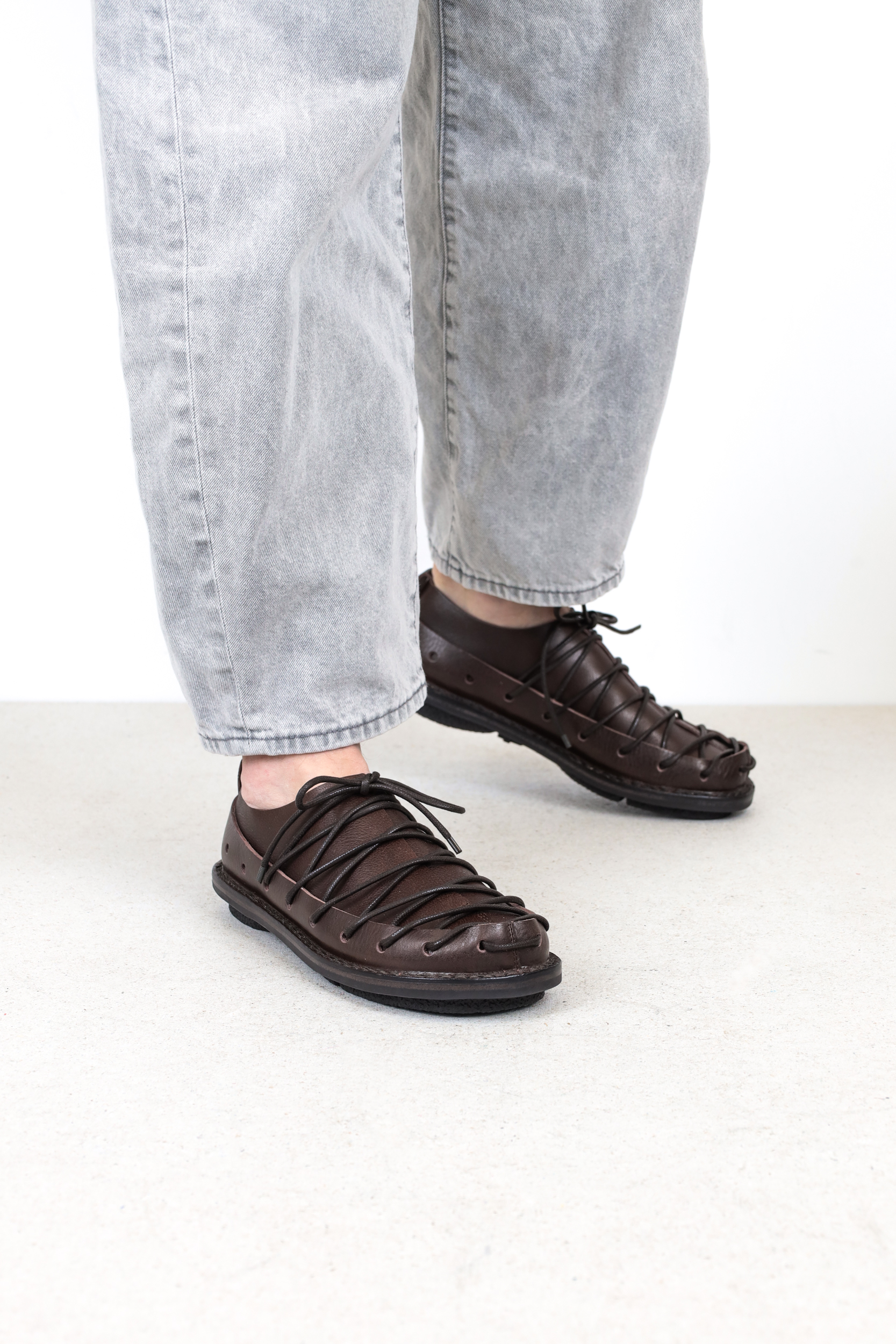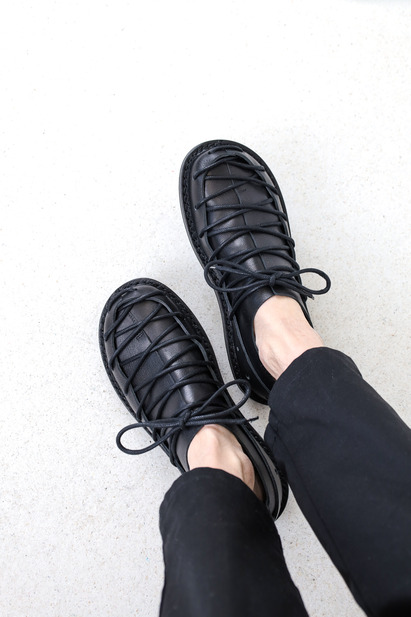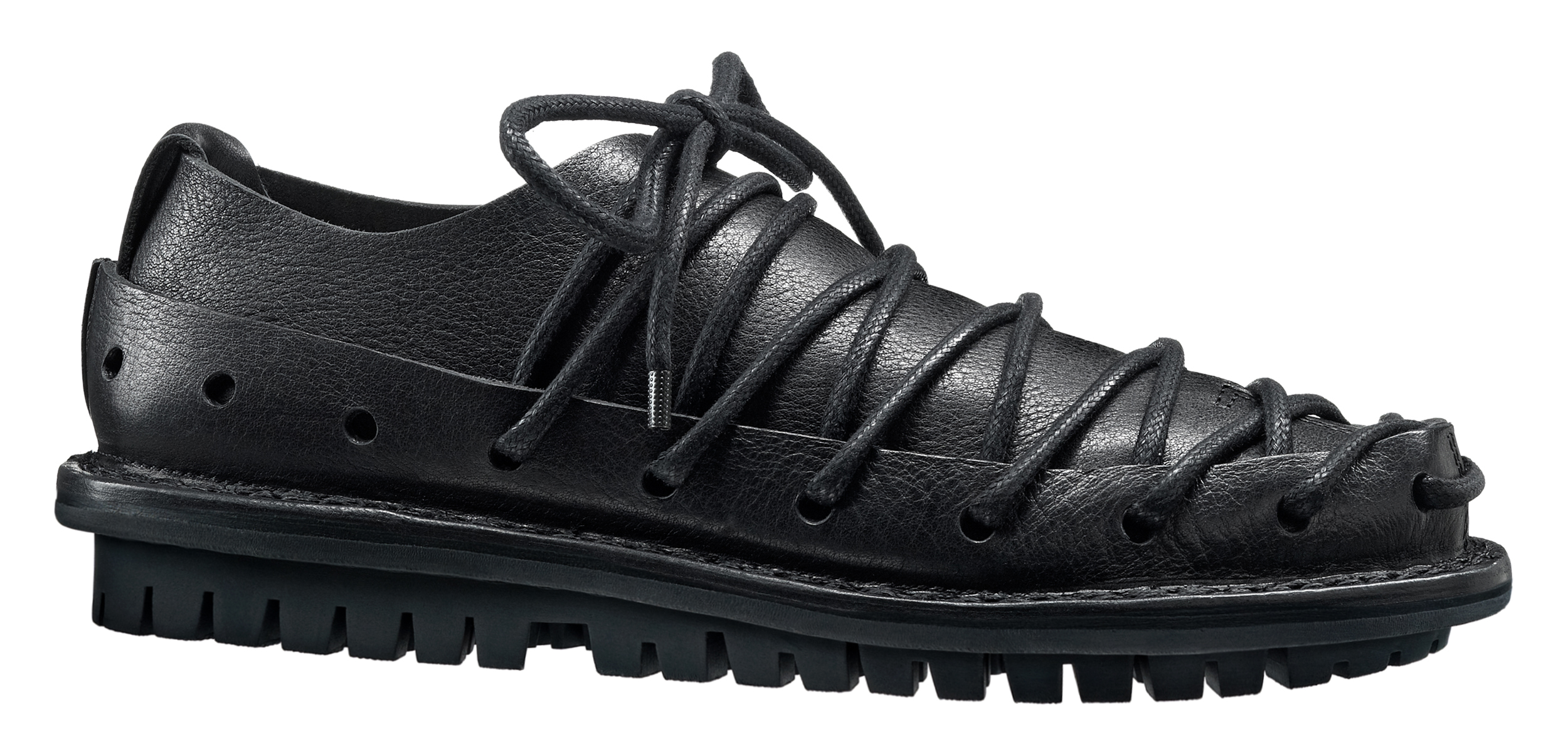 A circumferential perforated band made of sturdy leather holds the overlapping leather over the forefoot together in a tight lacing sequence.