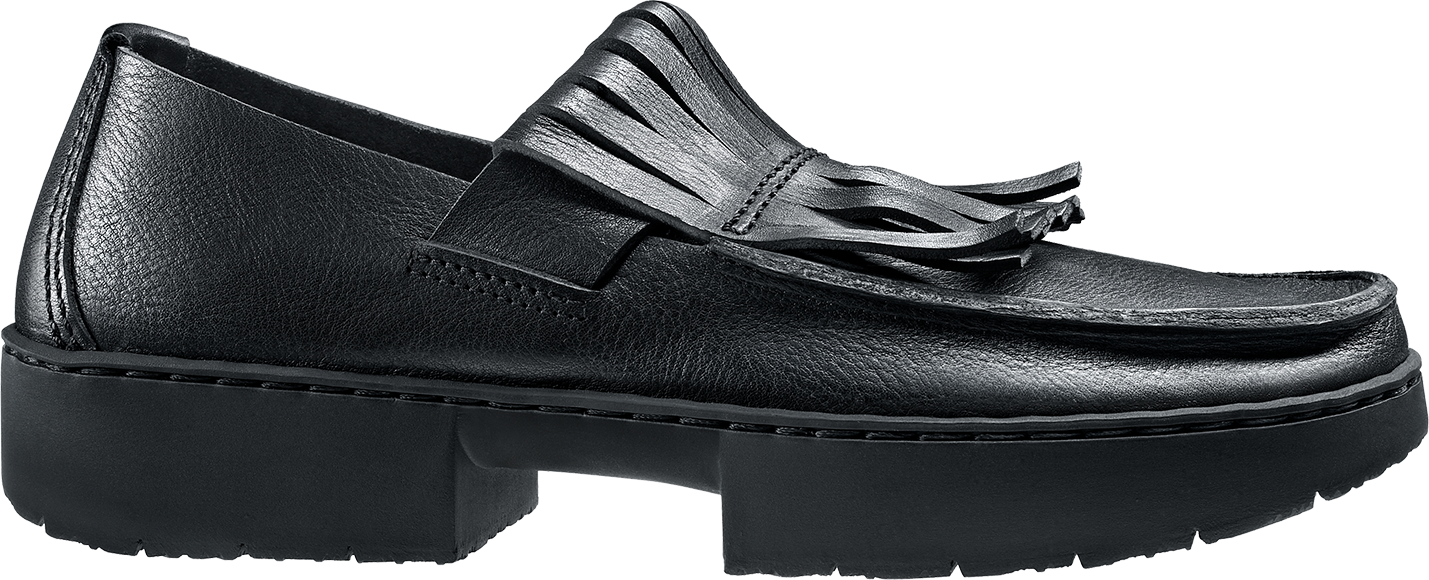 Men’s version of this style resembling a classic loafer with a decorative fringe décor on the vamp. The raw seam around the vamp and the construction without a toe cap produce a slightly pointier shape. An elastic strap runs across the instep, neatly hidden beneath the fringe detail.