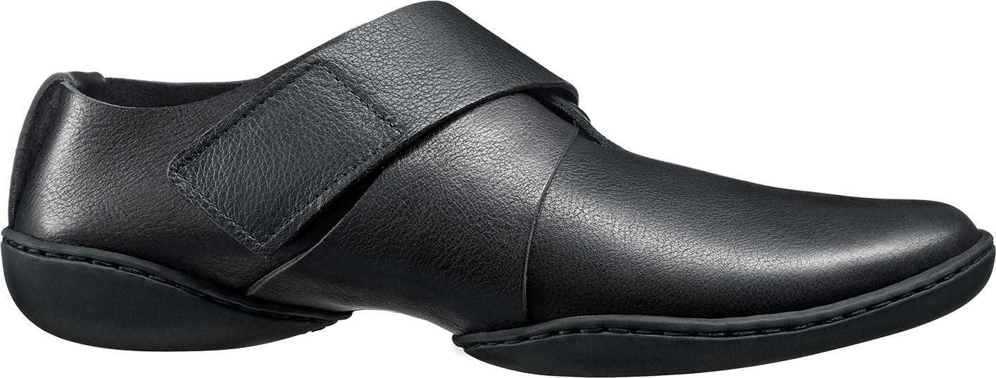 Sporty shoe with velcro fastening, decorative metal loop and dynamic lines.