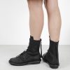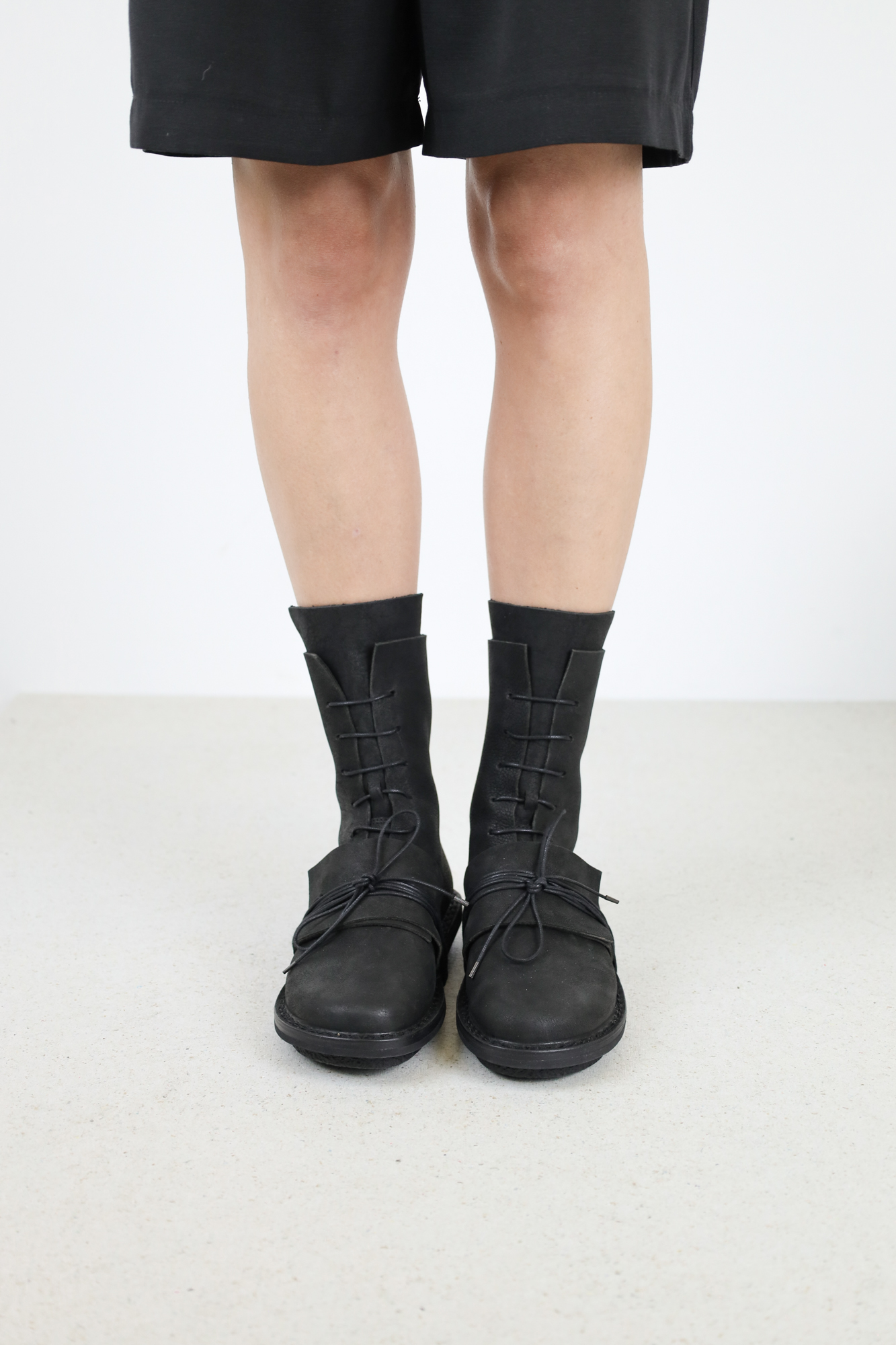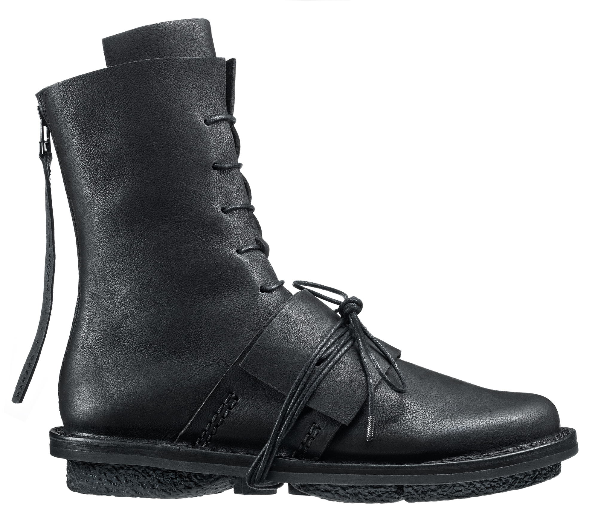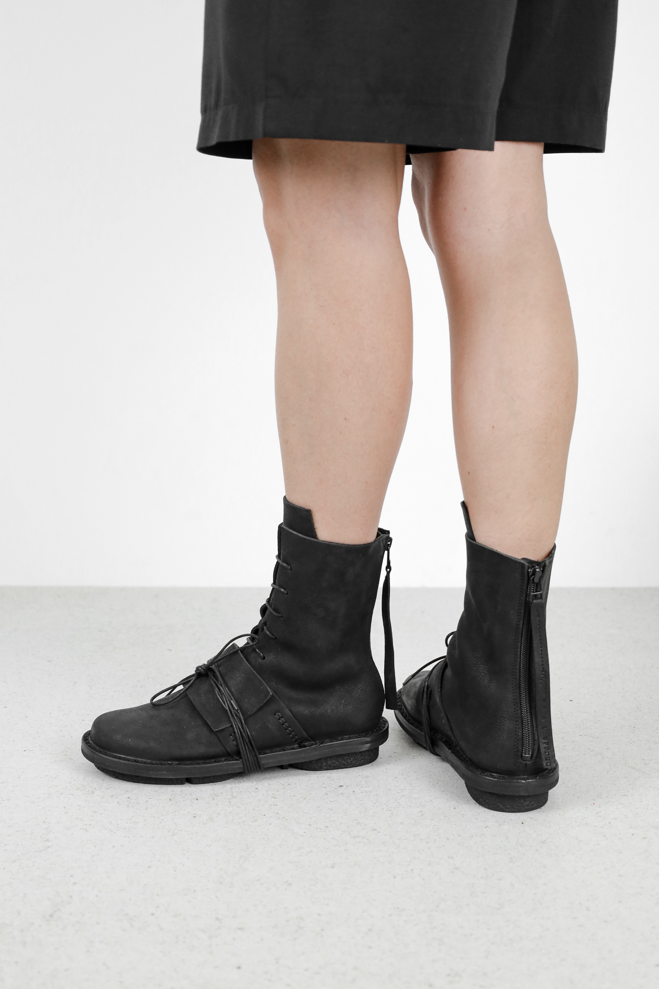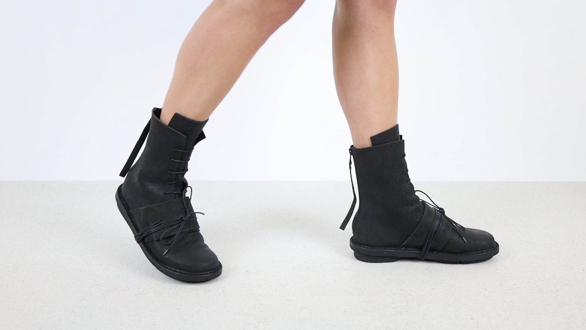 This ankle boot was created in collaboration with the Stuttgart label PalOffner. The lacing runs from top to bottom and wraps around overlapping leather parts around the instep and sole. The boot closes with a zipper at the back.