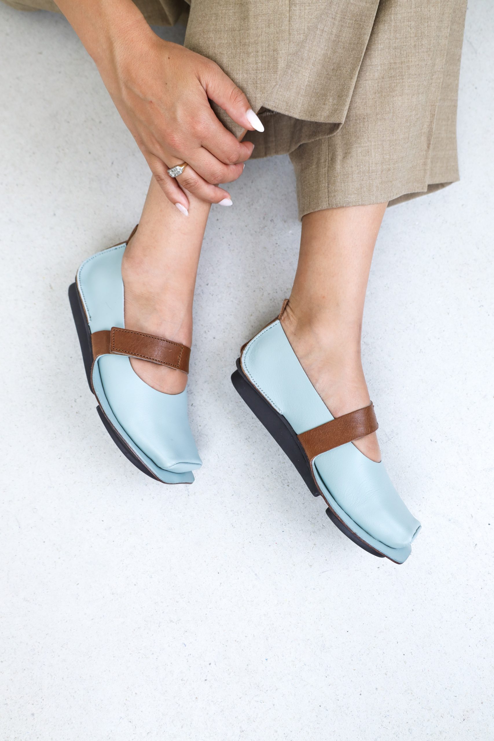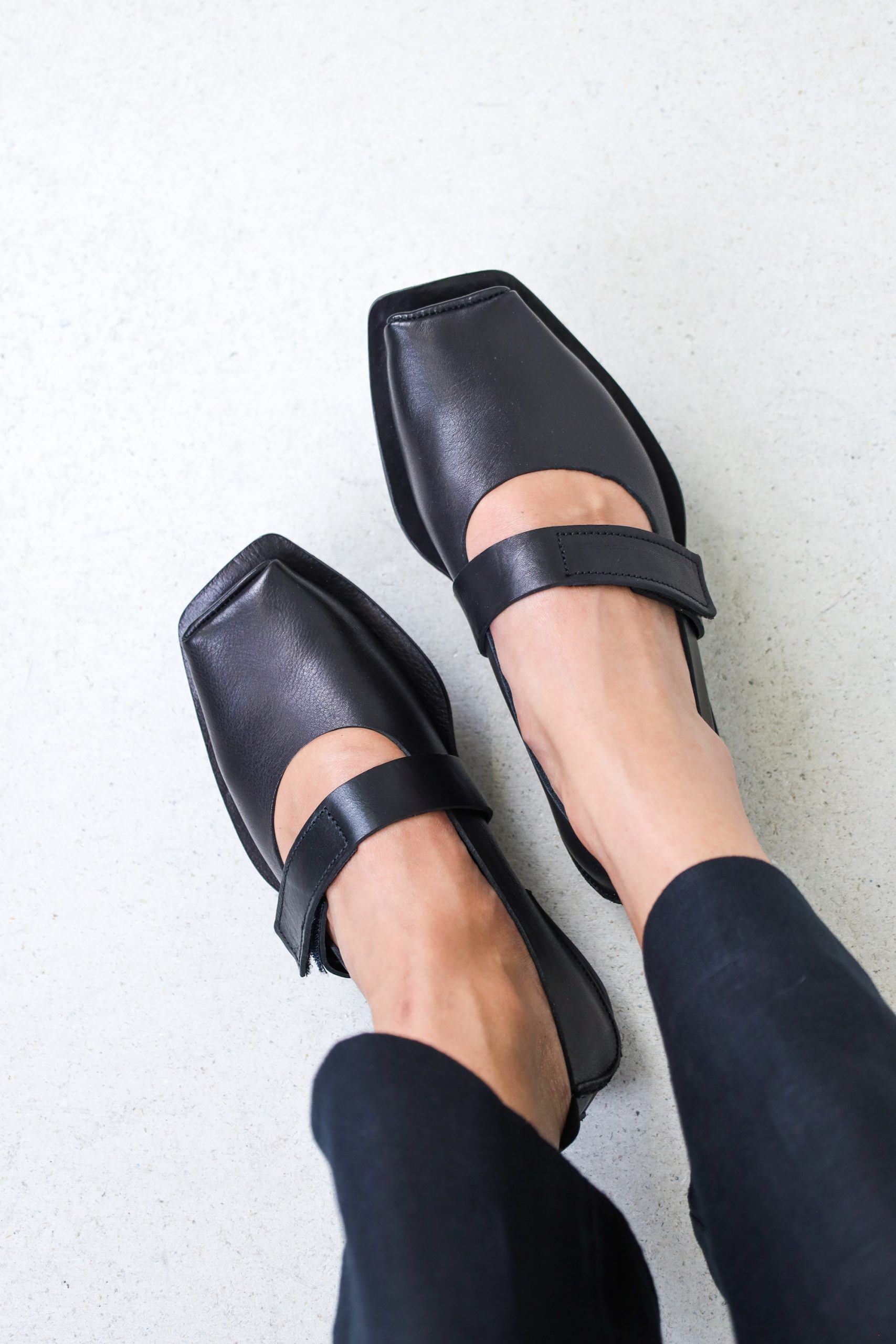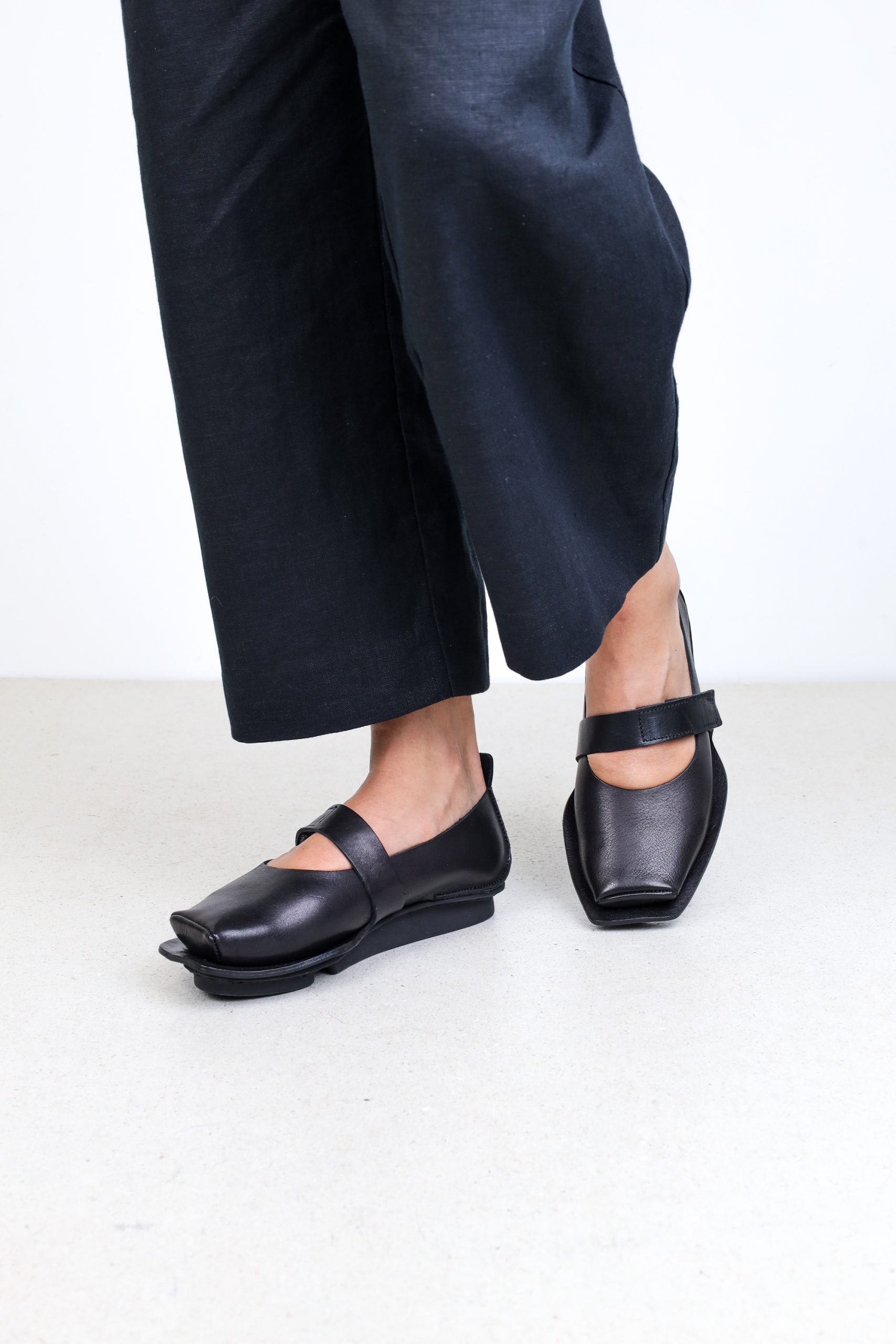 Between the Mary Jane ballerina and the flat Penna sole, a strikingly wraparound midsole is incorporated, which ends in an elegant line in a strap with a Velcro fastening over the instep.