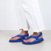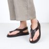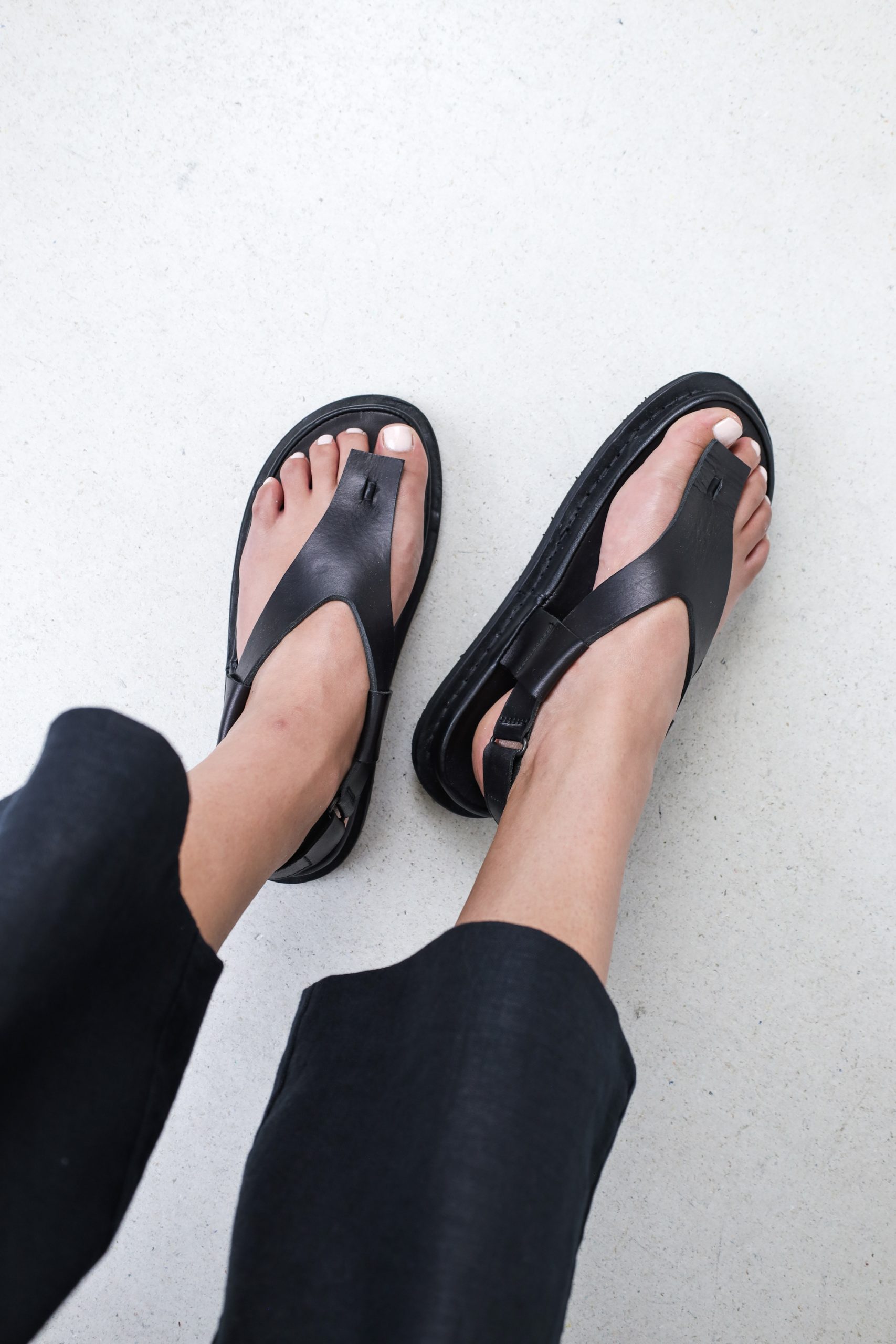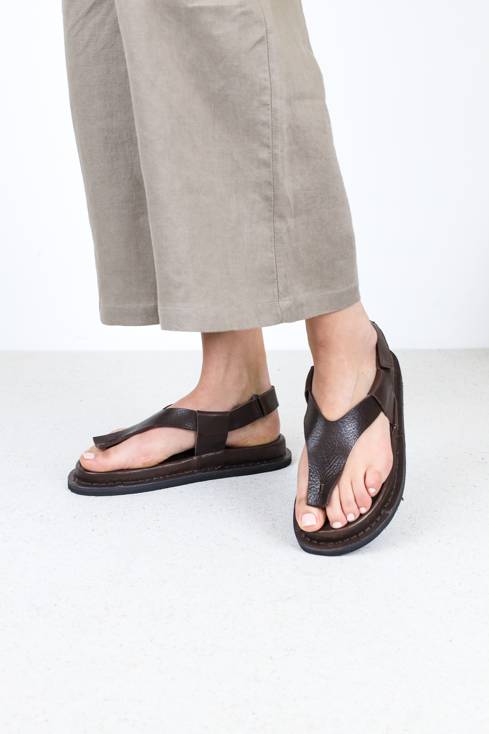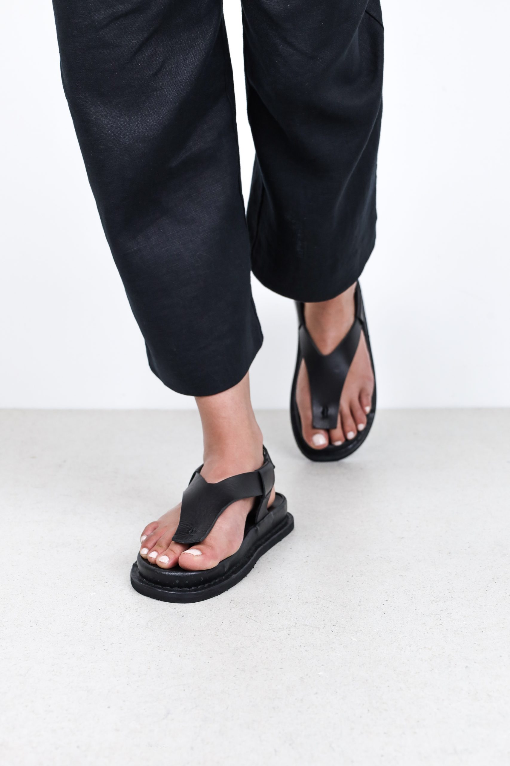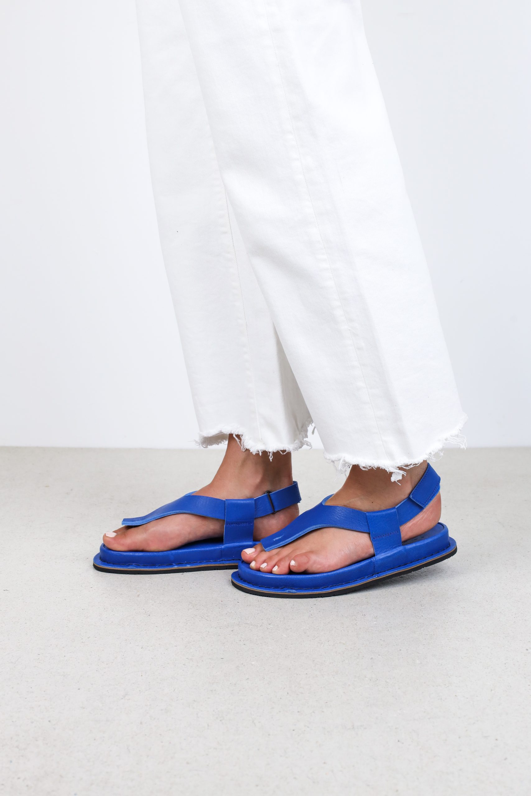Starting with a minimalist design on a small toe bridge, an elegant split strap wraps around the foot and is held in place with a Velcro fastening.