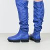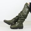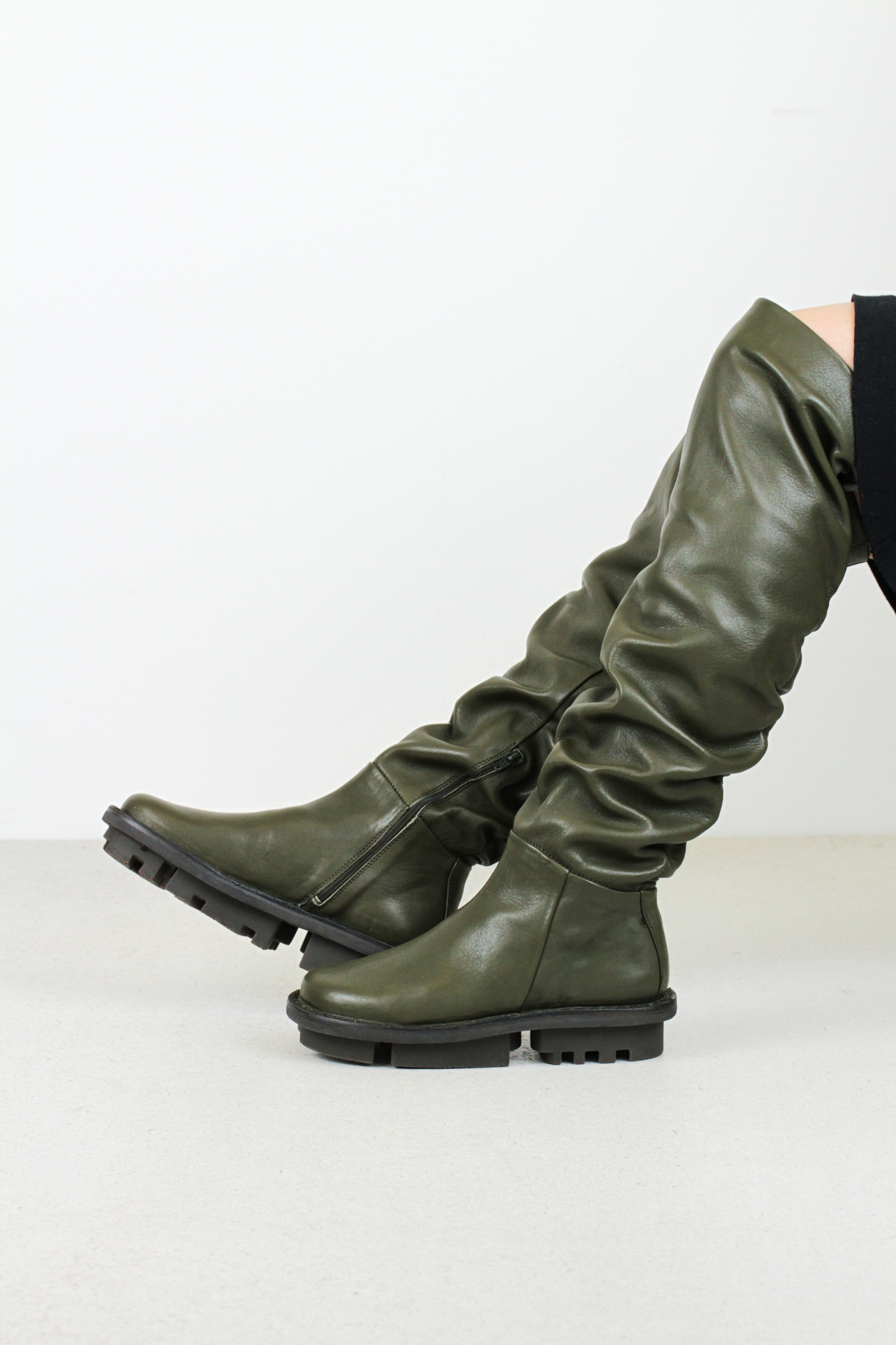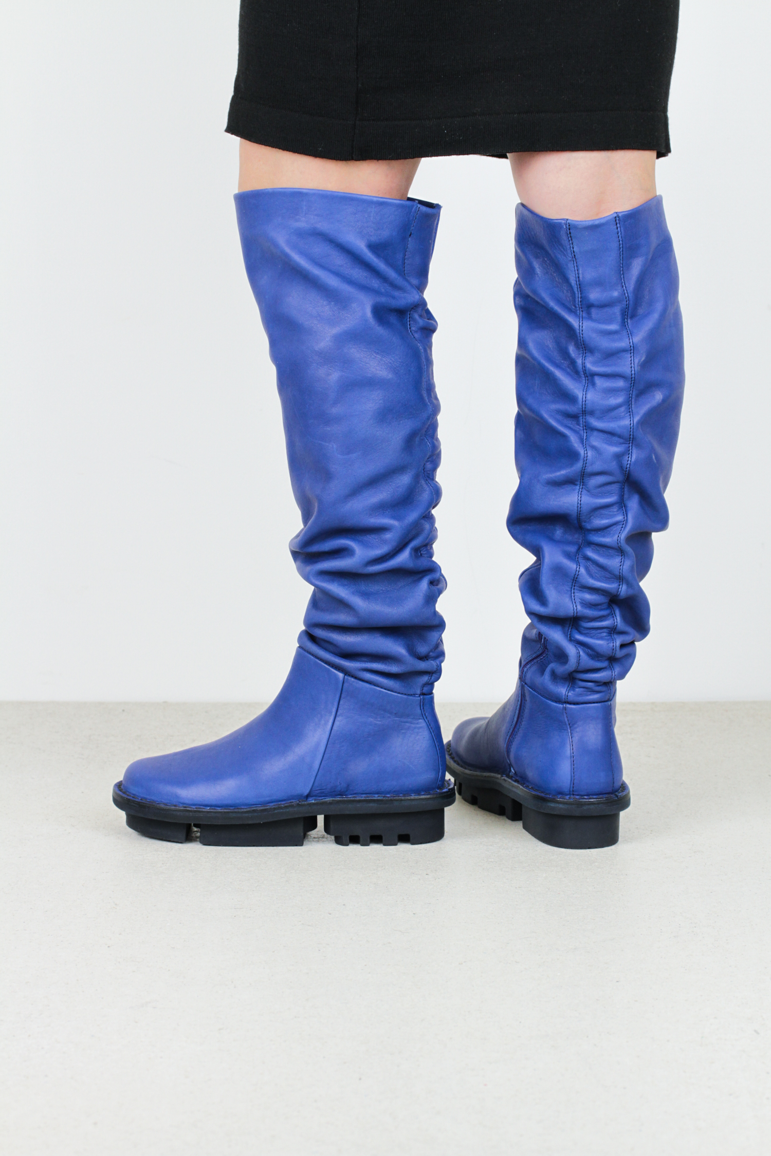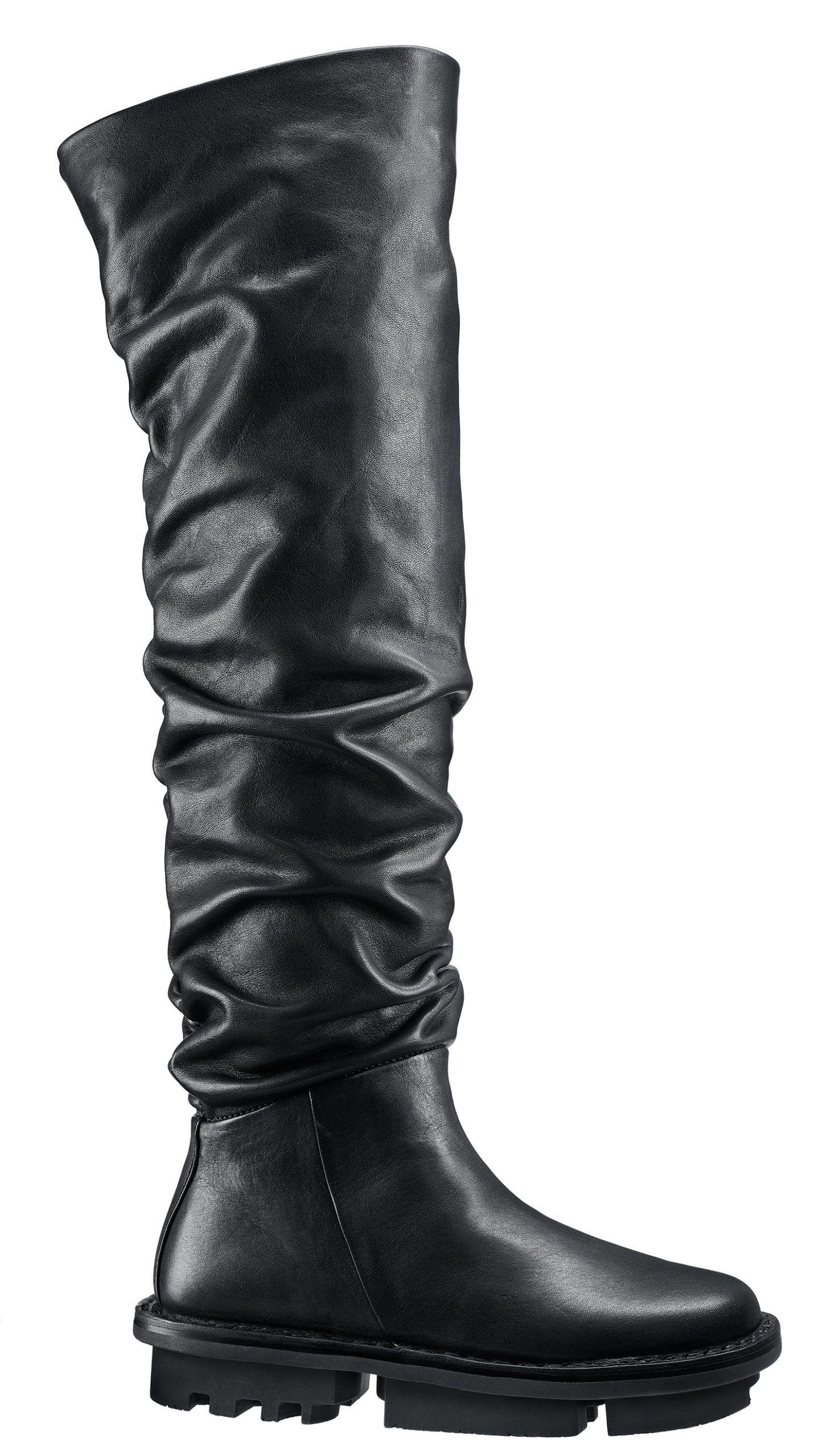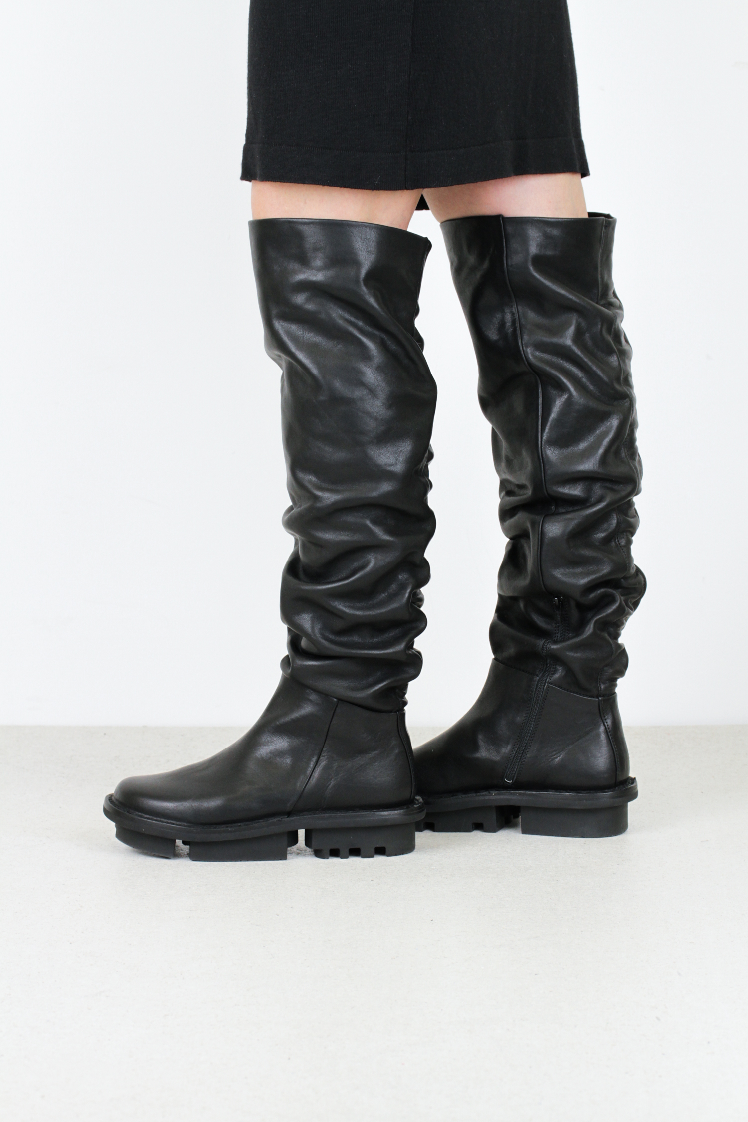 This thigh-high boot is flexible and loose-fitting, with an elastic that creates a ruched effect and provides more space in the leg of the boot.