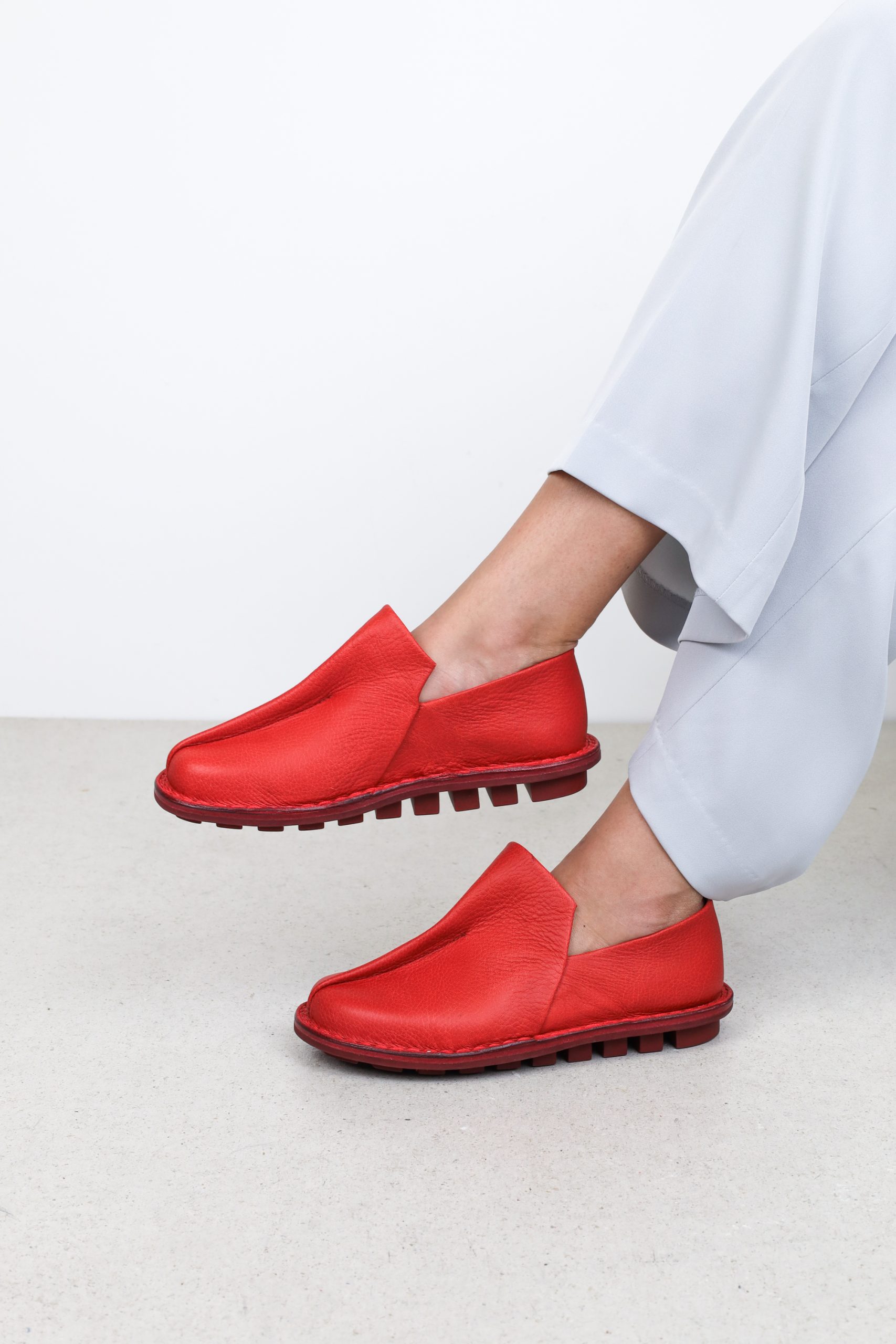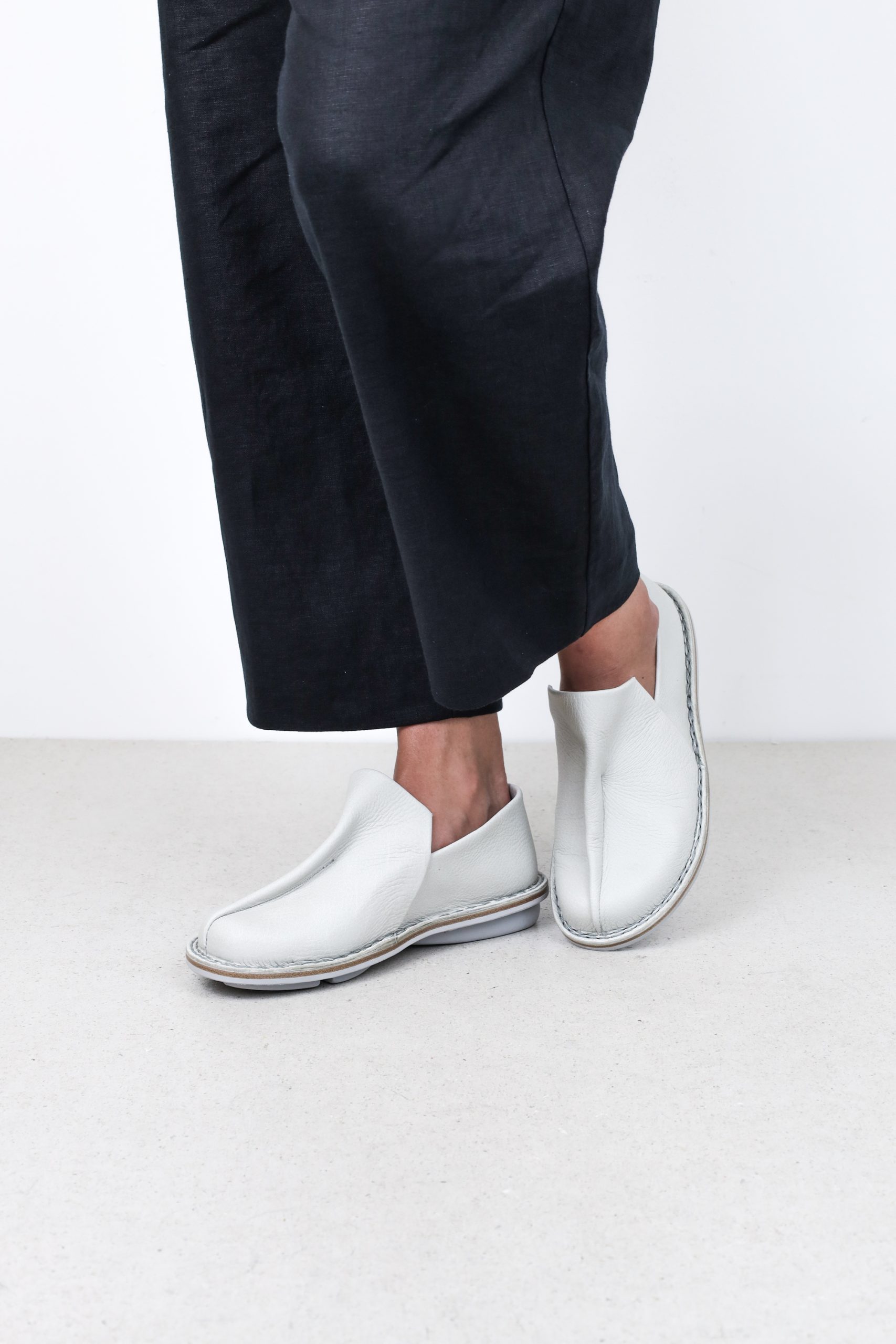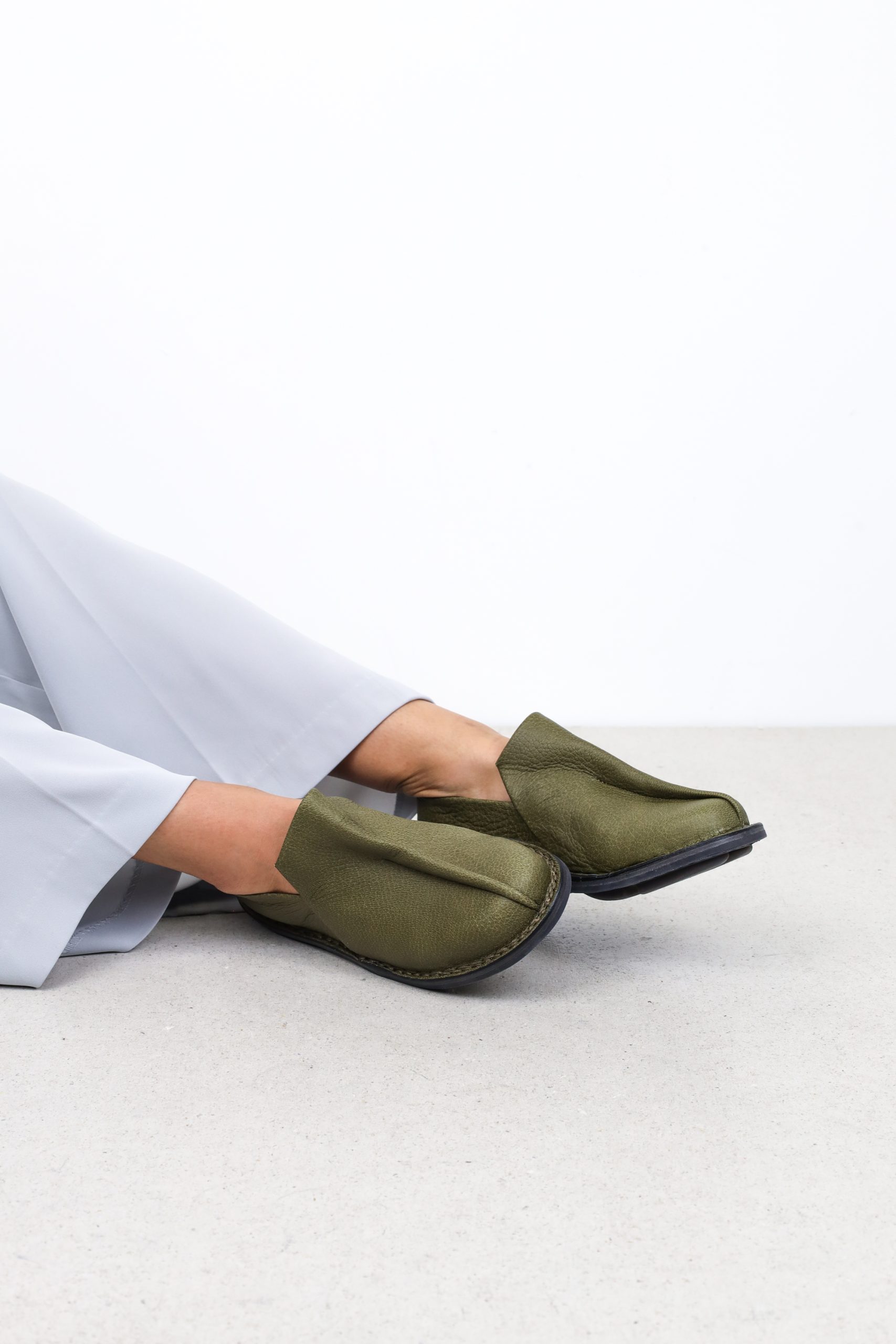 The crease over the instep twists gracefully as you walk. The hidden elasticated strap under the soft deerskin gives the foot support.