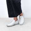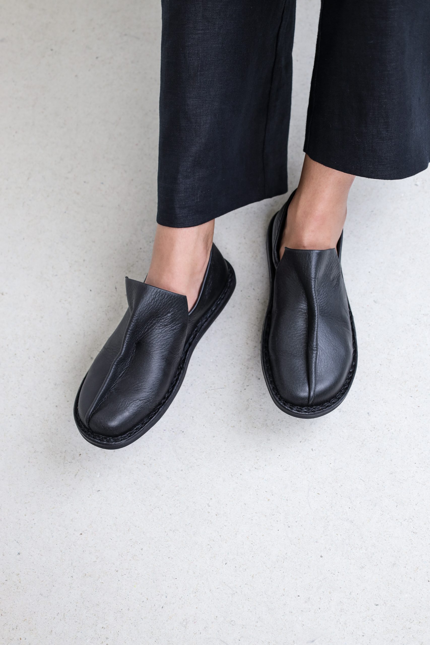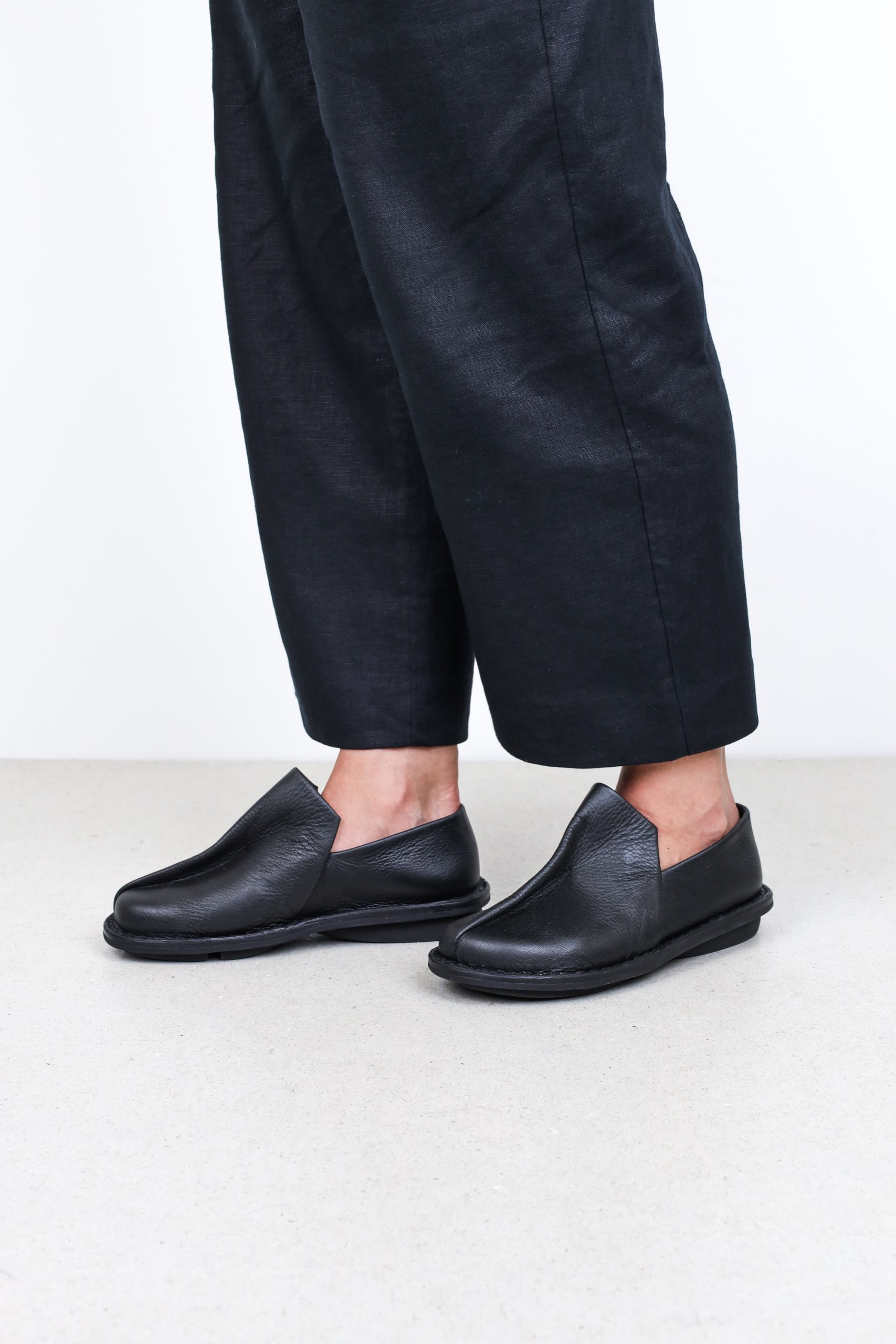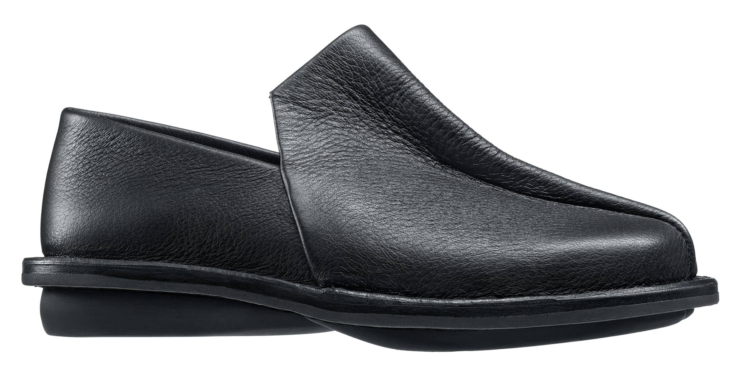 The crease over the instep twists gracefully as you walk. The hidden elasticated strap under the soft deerskin gives the foot support.
