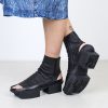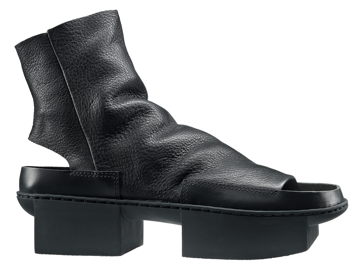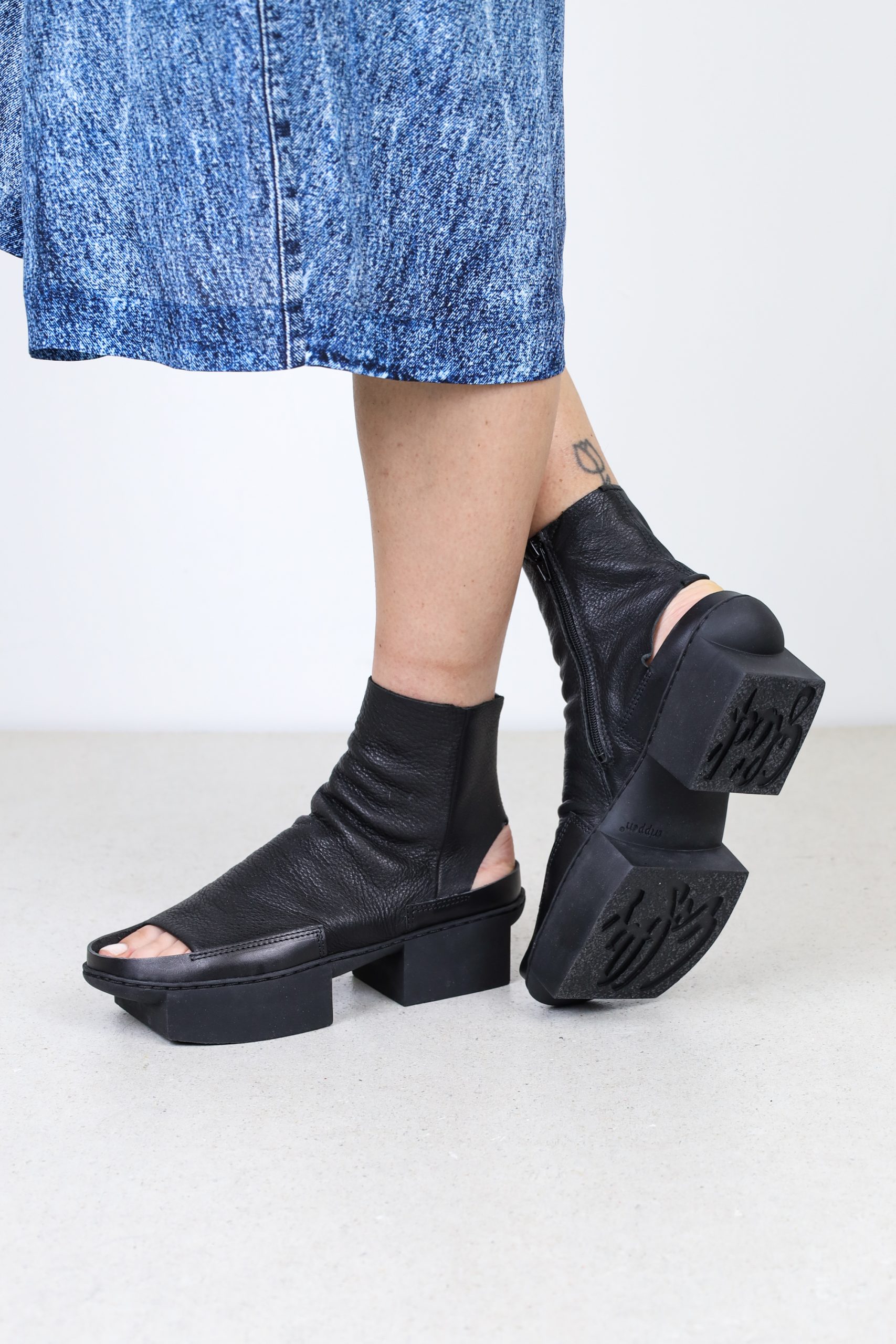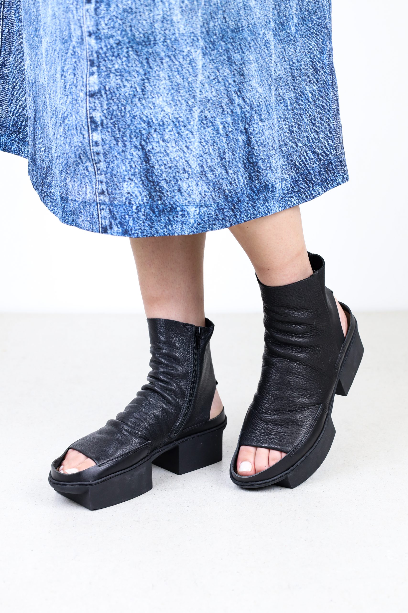 High-cut unisex sandal with an open toe section protected by a strip of firmer leather, and an equally open heel section, whose soft shaft falls over the instep in light pleats. The interior zip provides additional comfort.