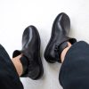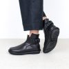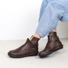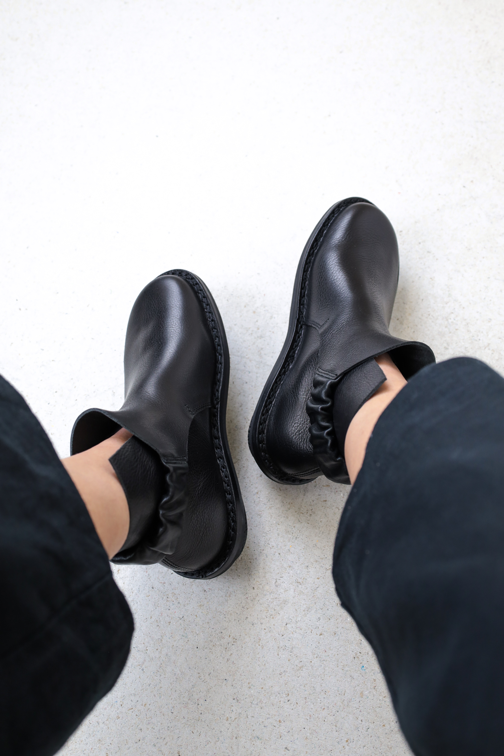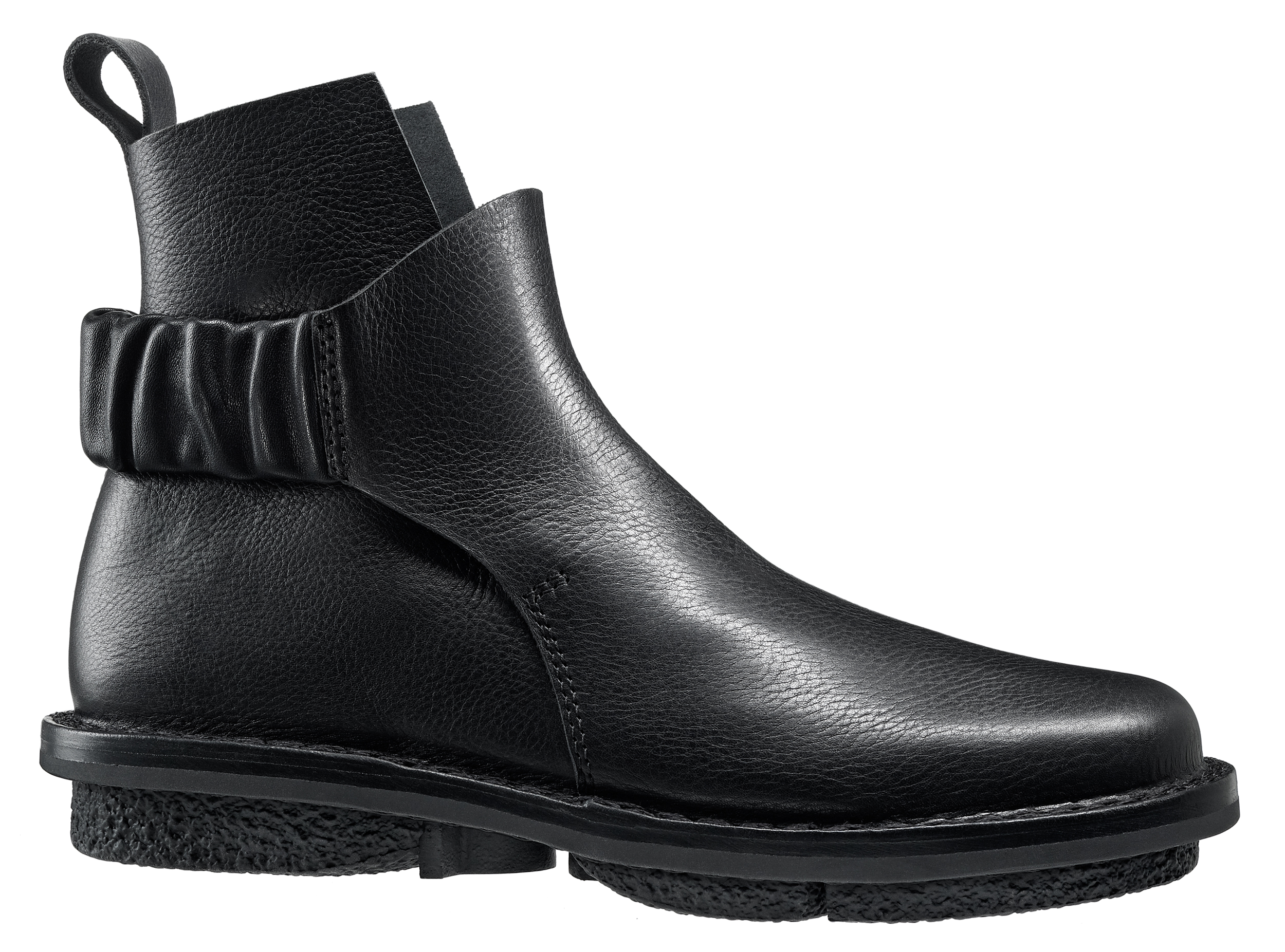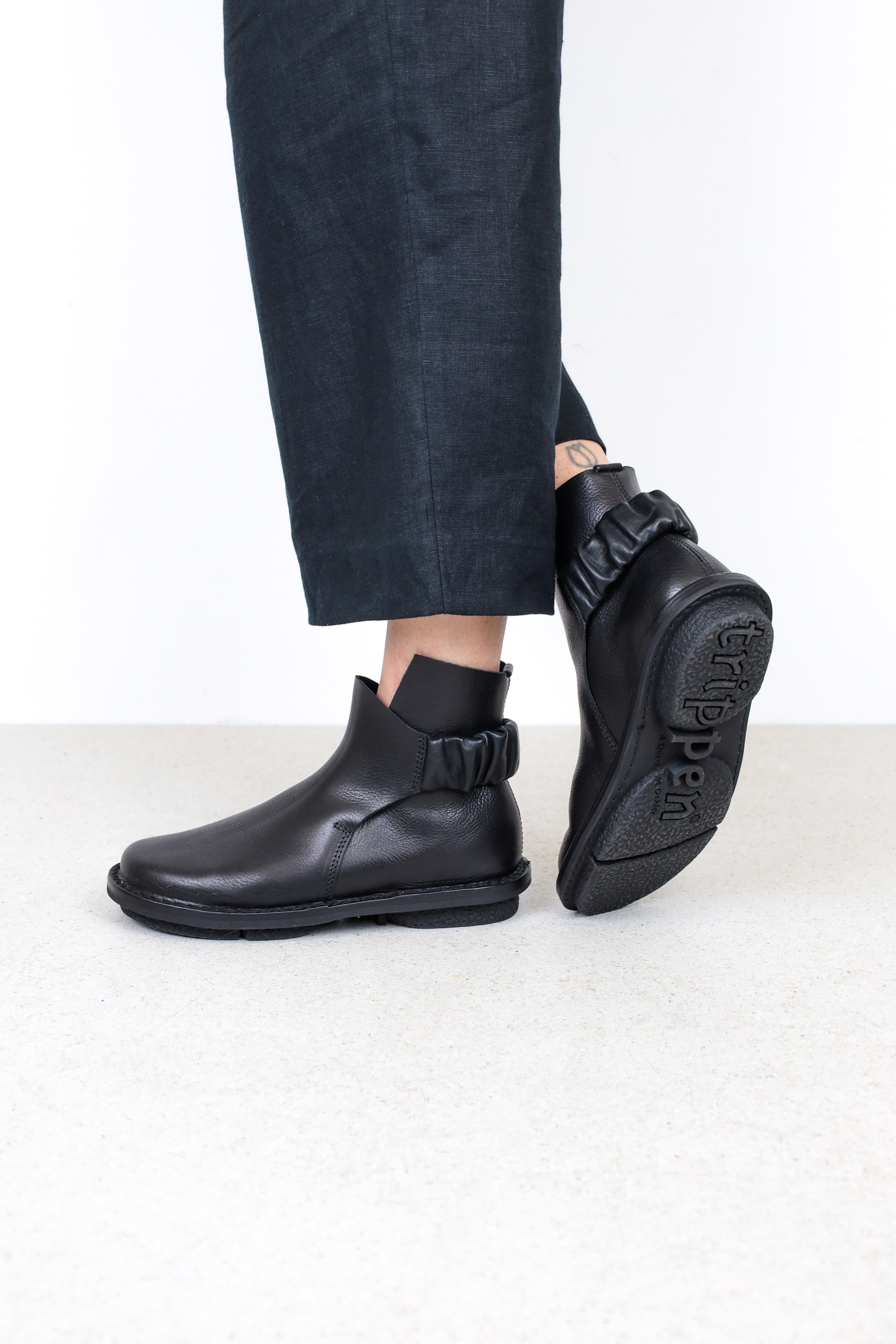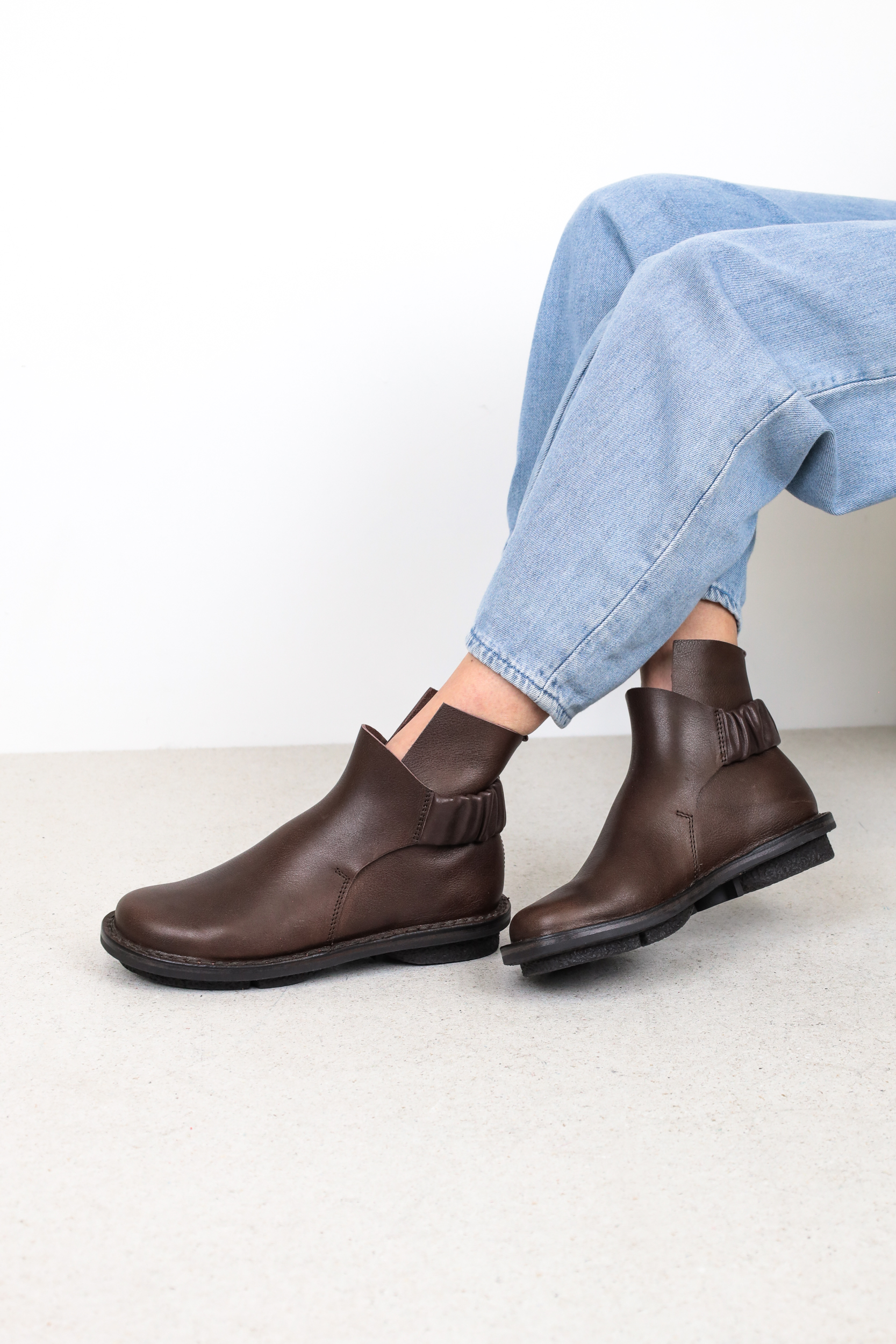 The front and heel sections of this ankle bootie are held together by a leather-covered elasticated strap over the heel.