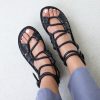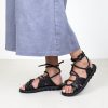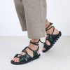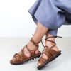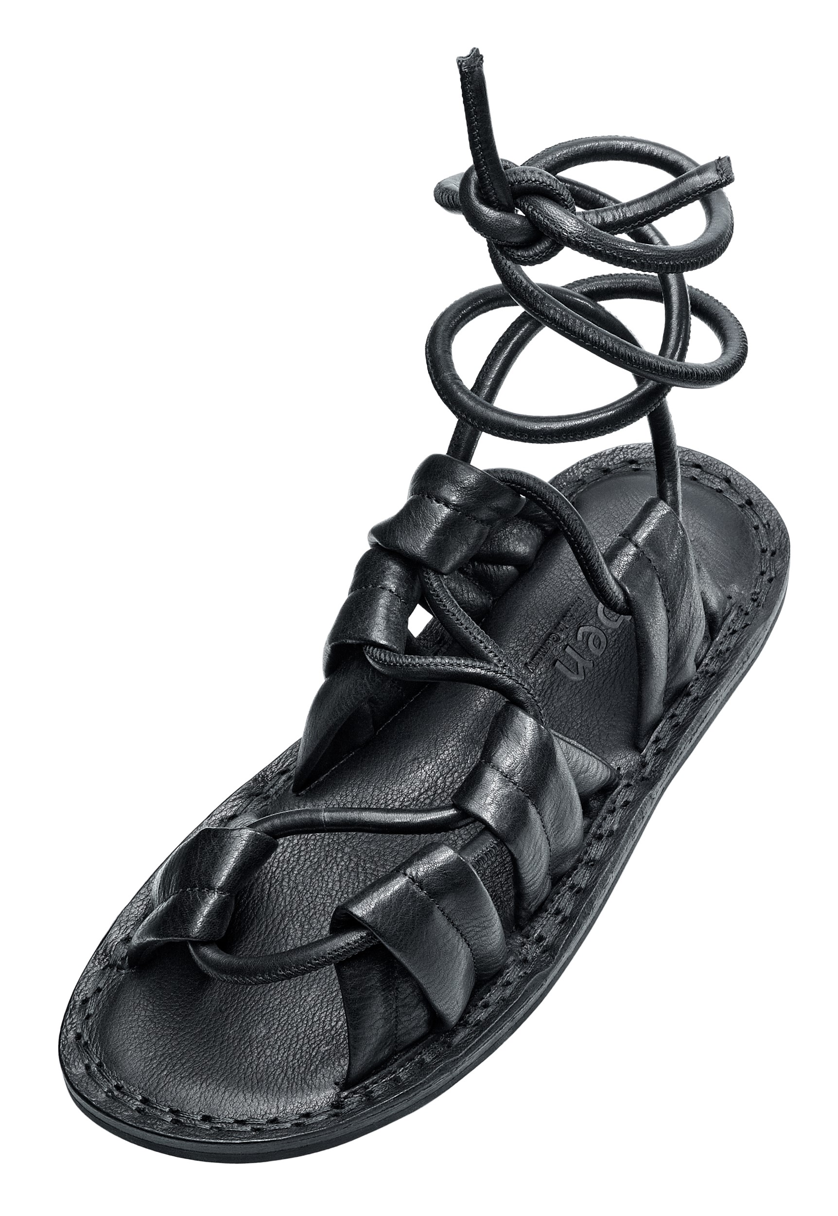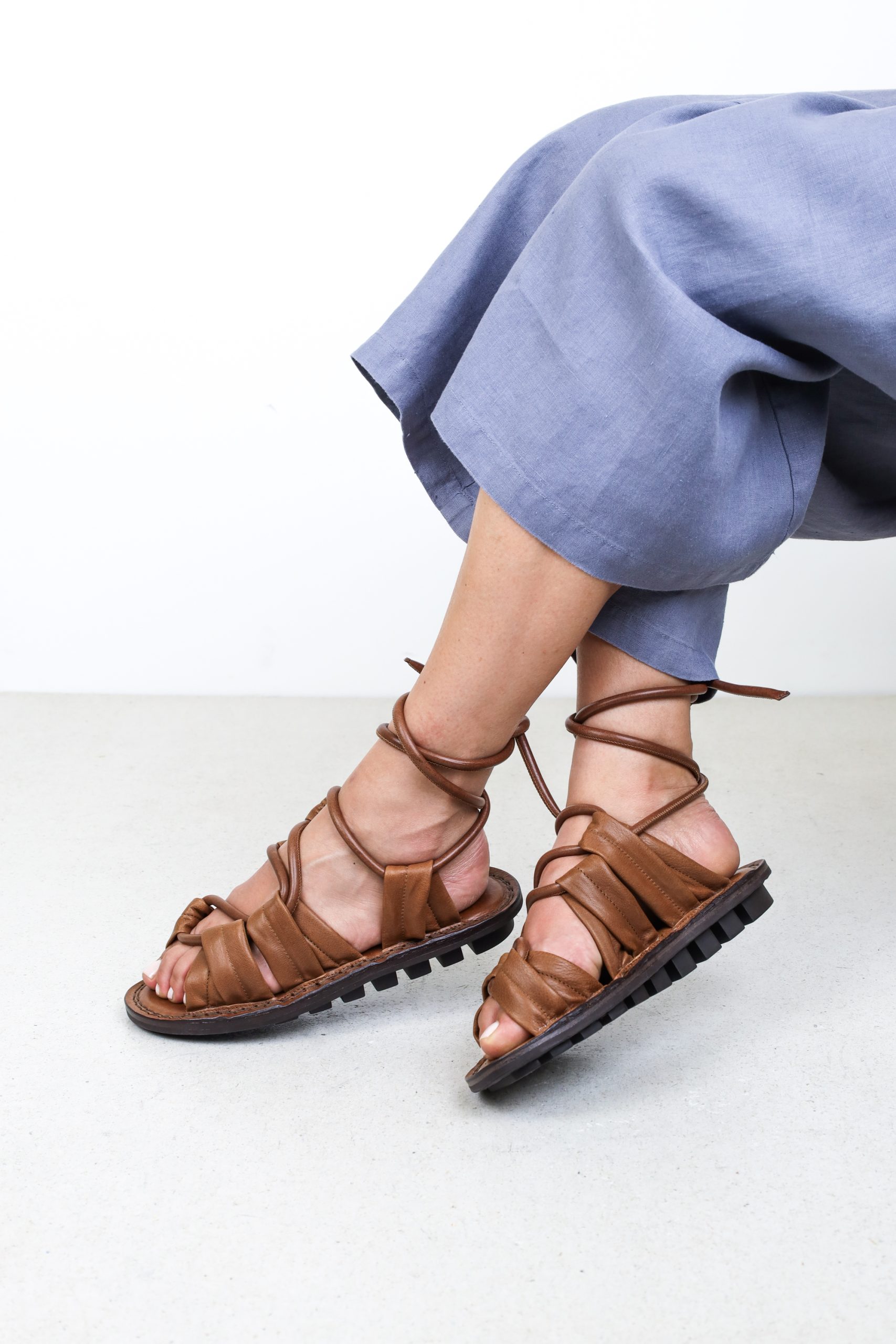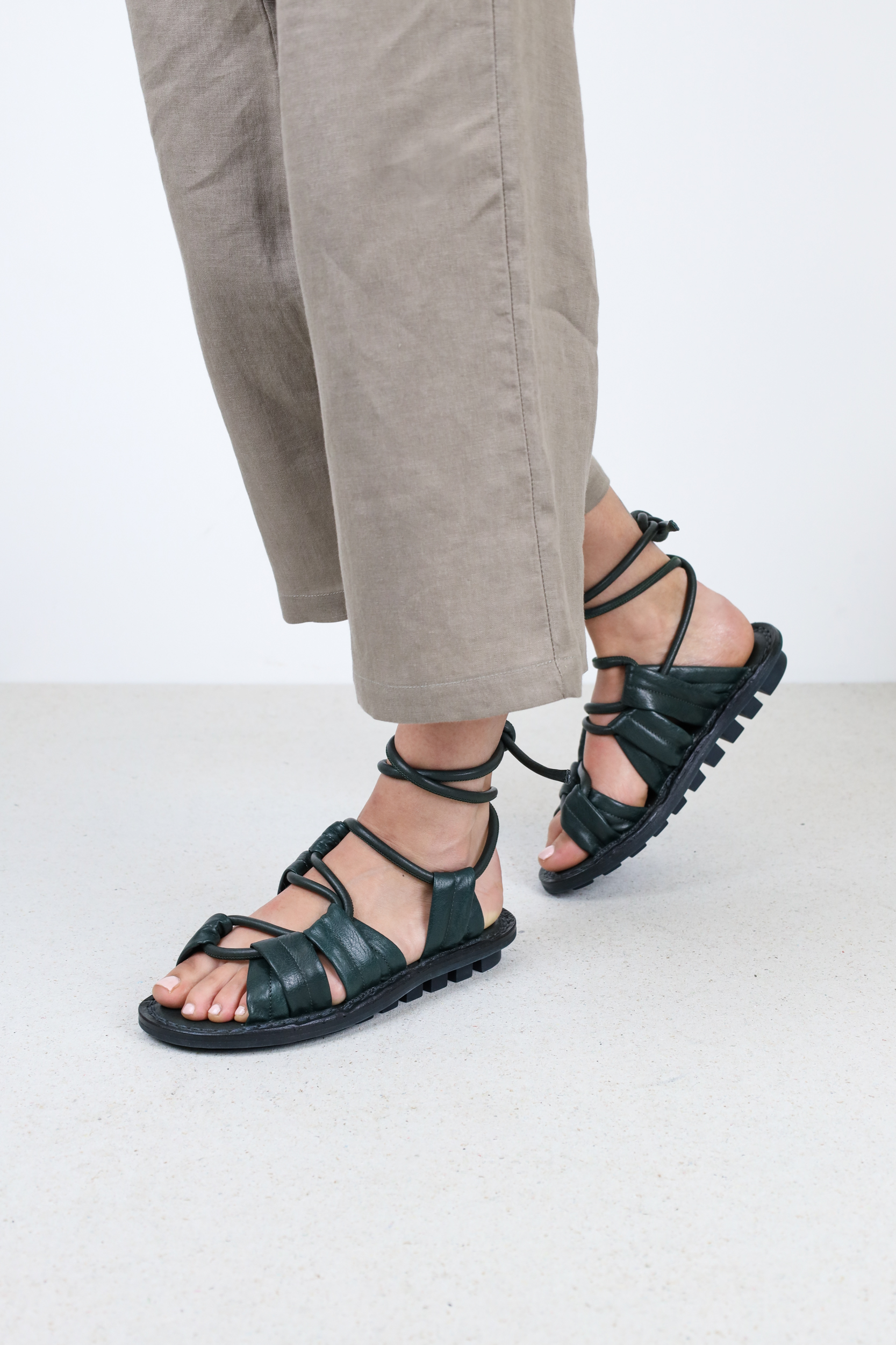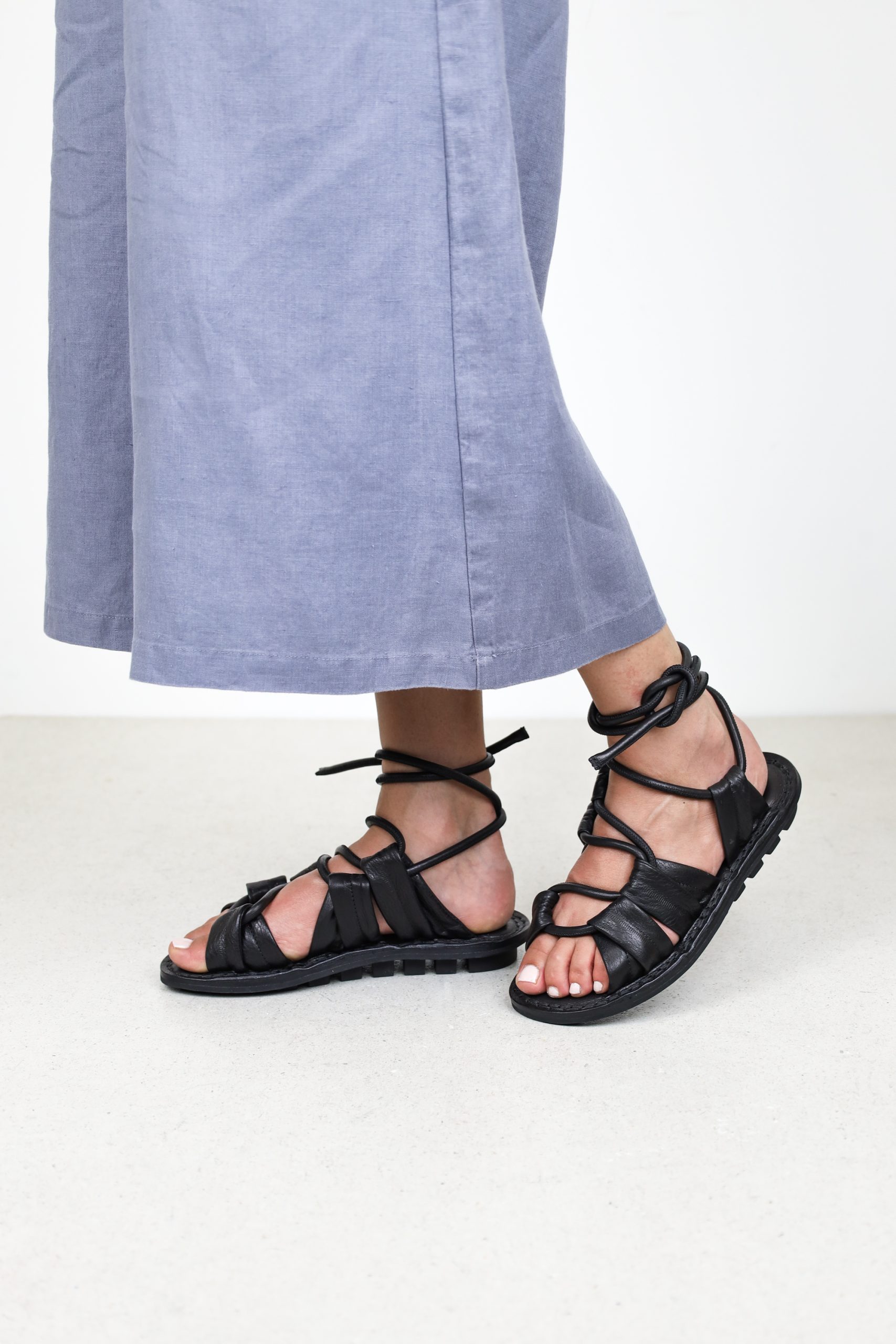 In an asymmetrical curved wave, a leather lace is passed through three soft leather loops on each side and tied up around the ankle.