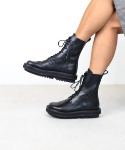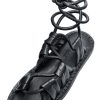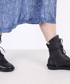In an asymmetrical curved wave, a leather lace is passed through three soft leather loops on each side and tied up around the ankle.