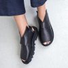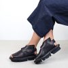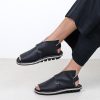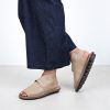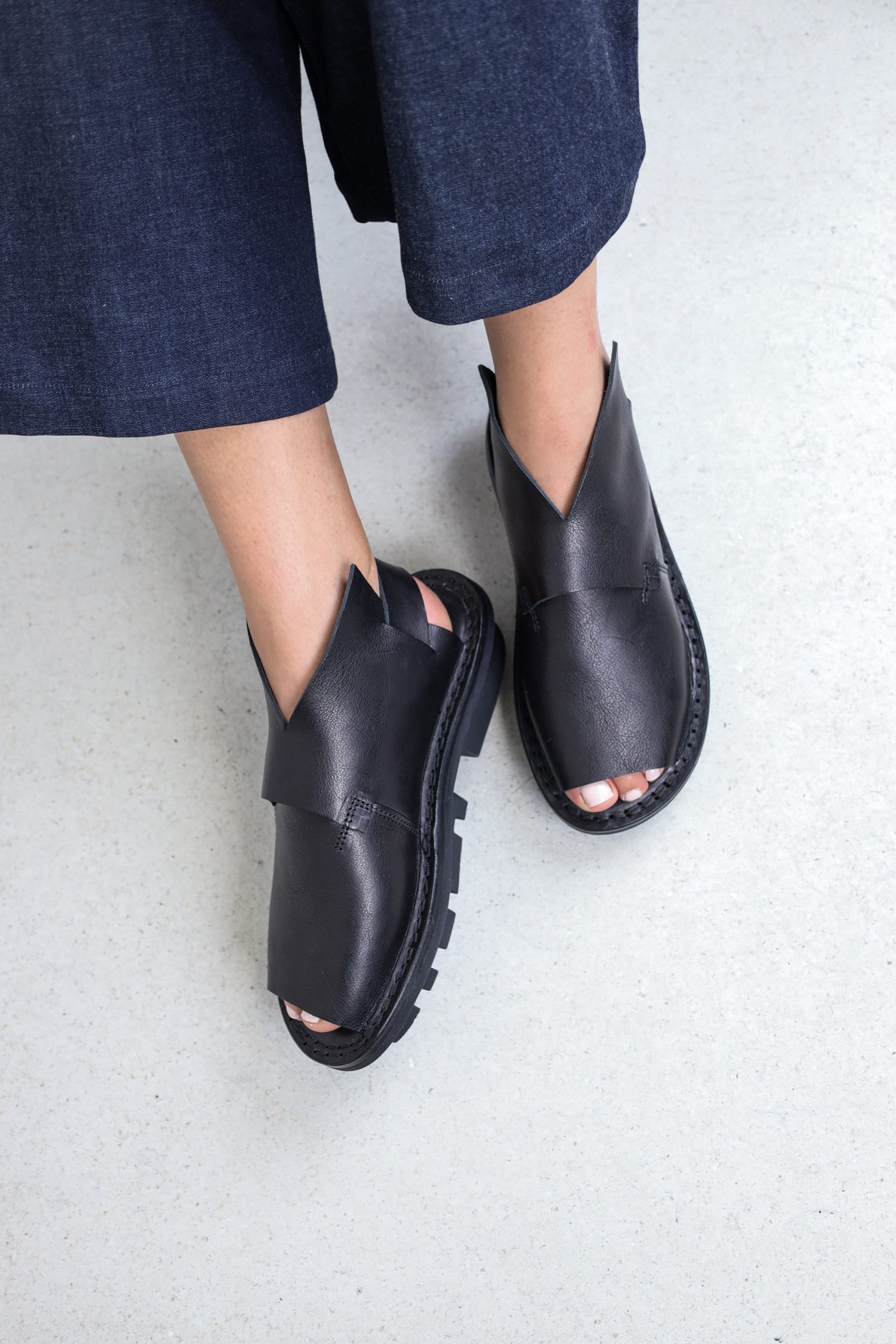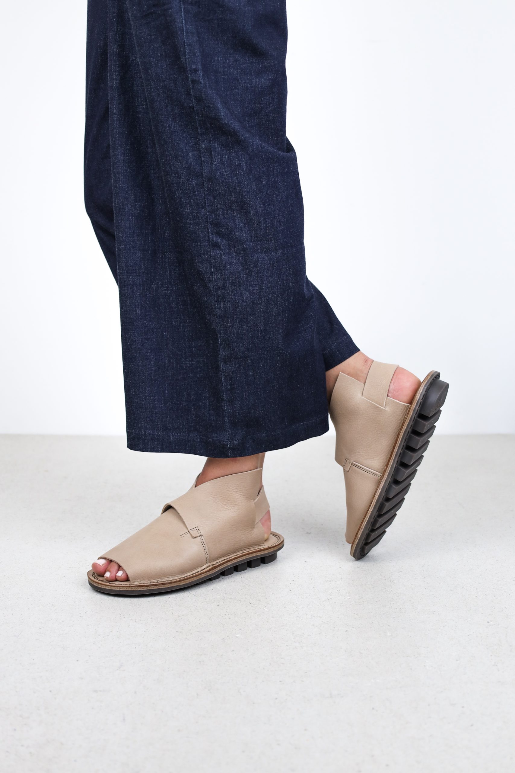 This sandal is crafted with two distinct height panels that stand on the foot, and the gap created between the panels allows for breathability. A leather strap behind the ankle is secured with hidden elastic-bands.