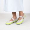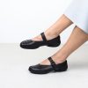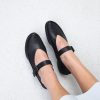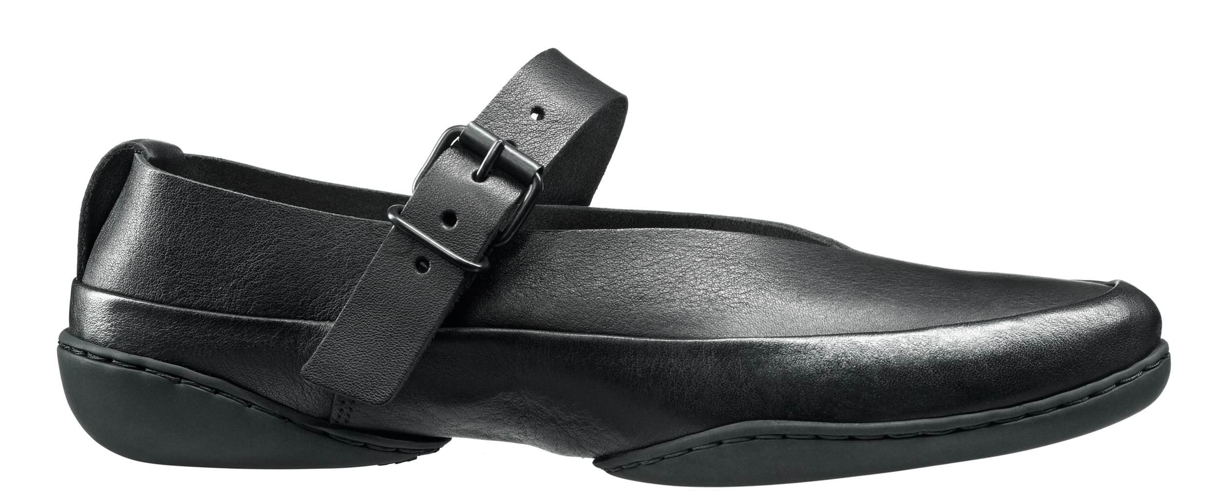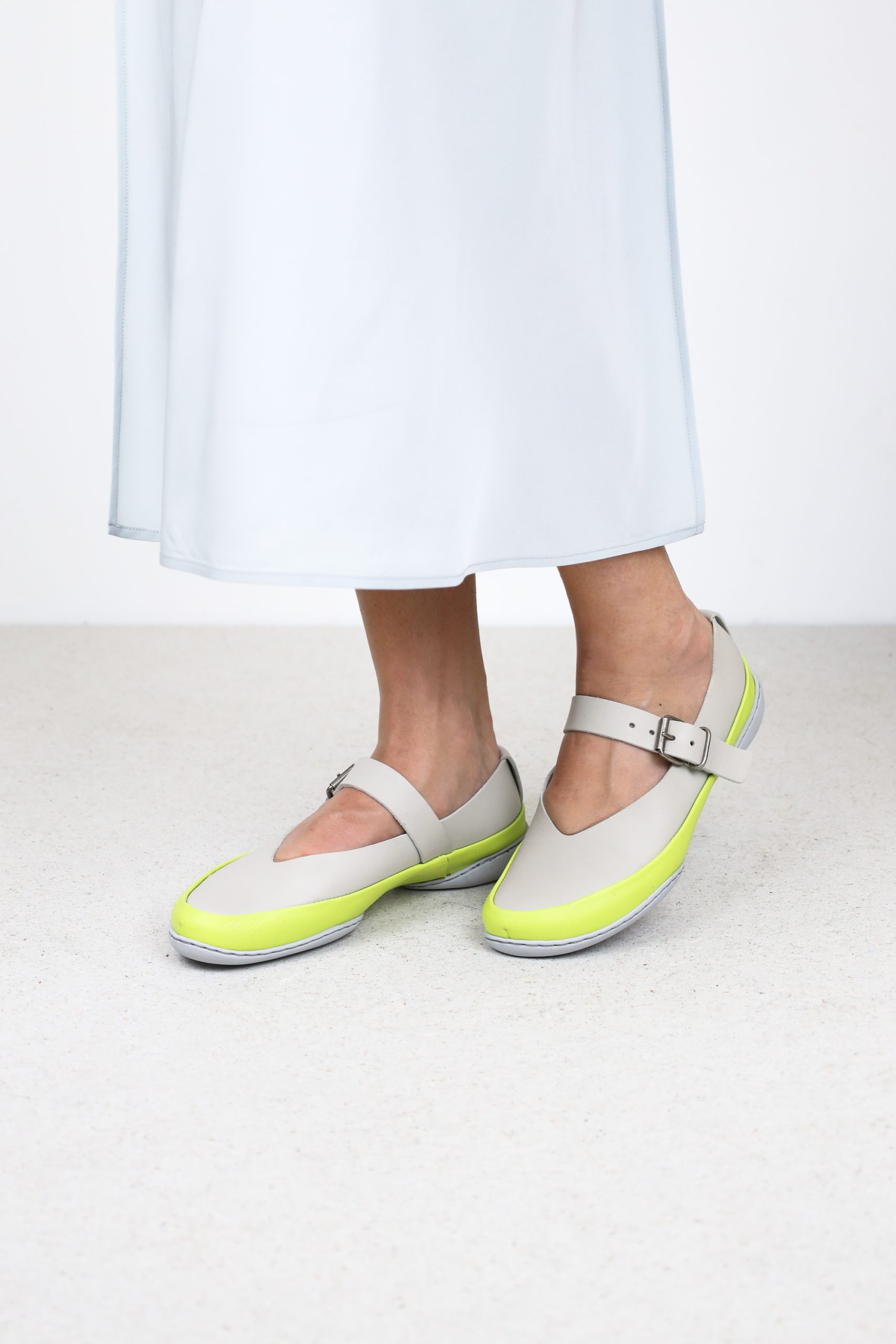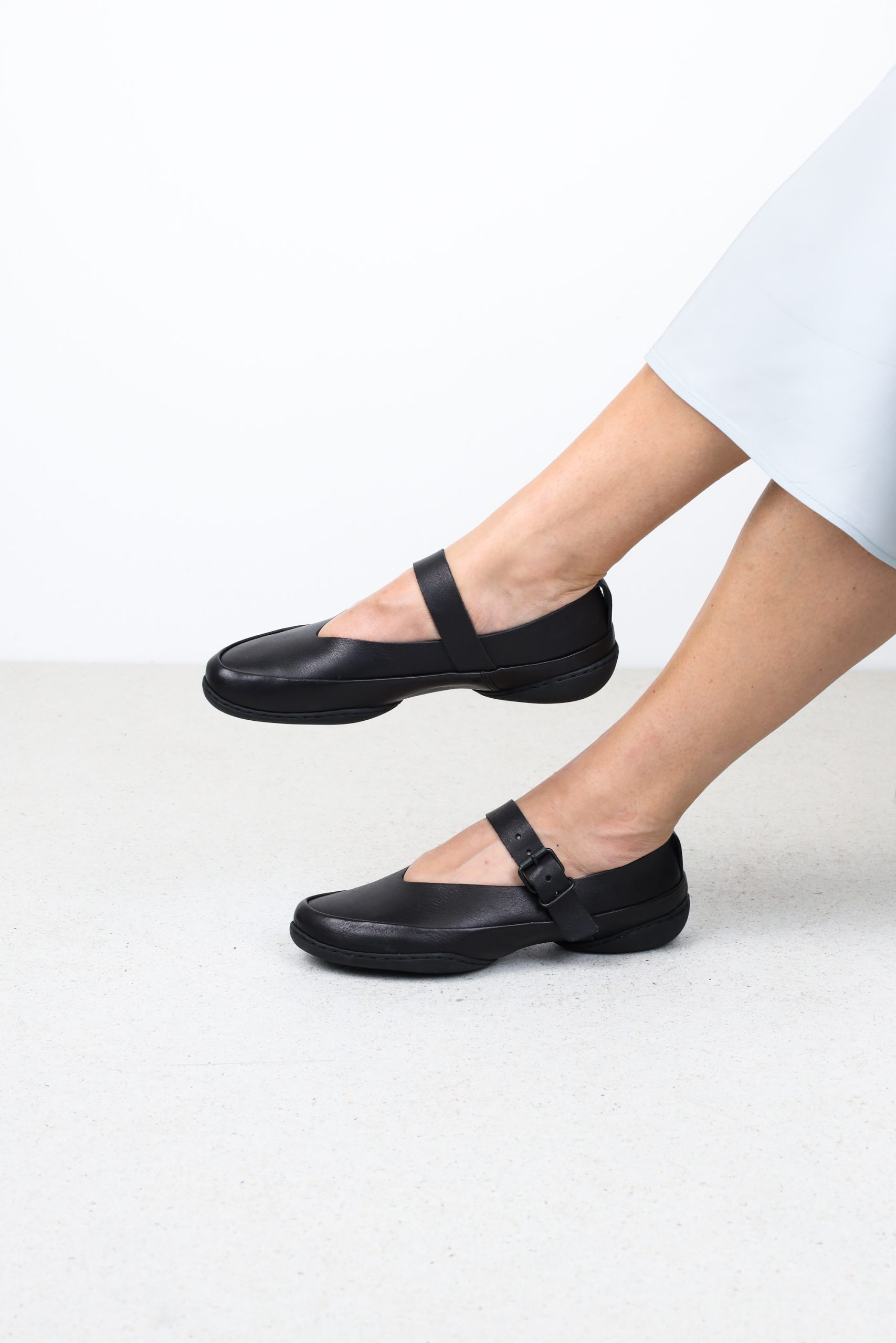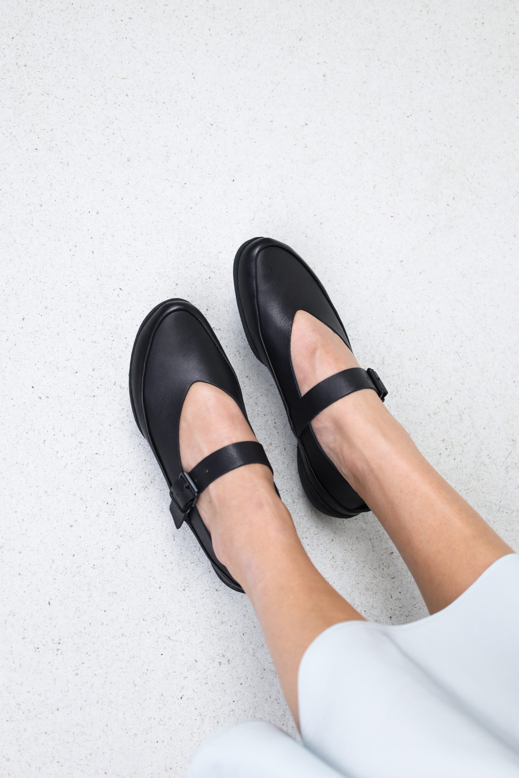 An elegant horizontal line runs around the entire ballerina. A strap with buckle fastening closes over the instep.