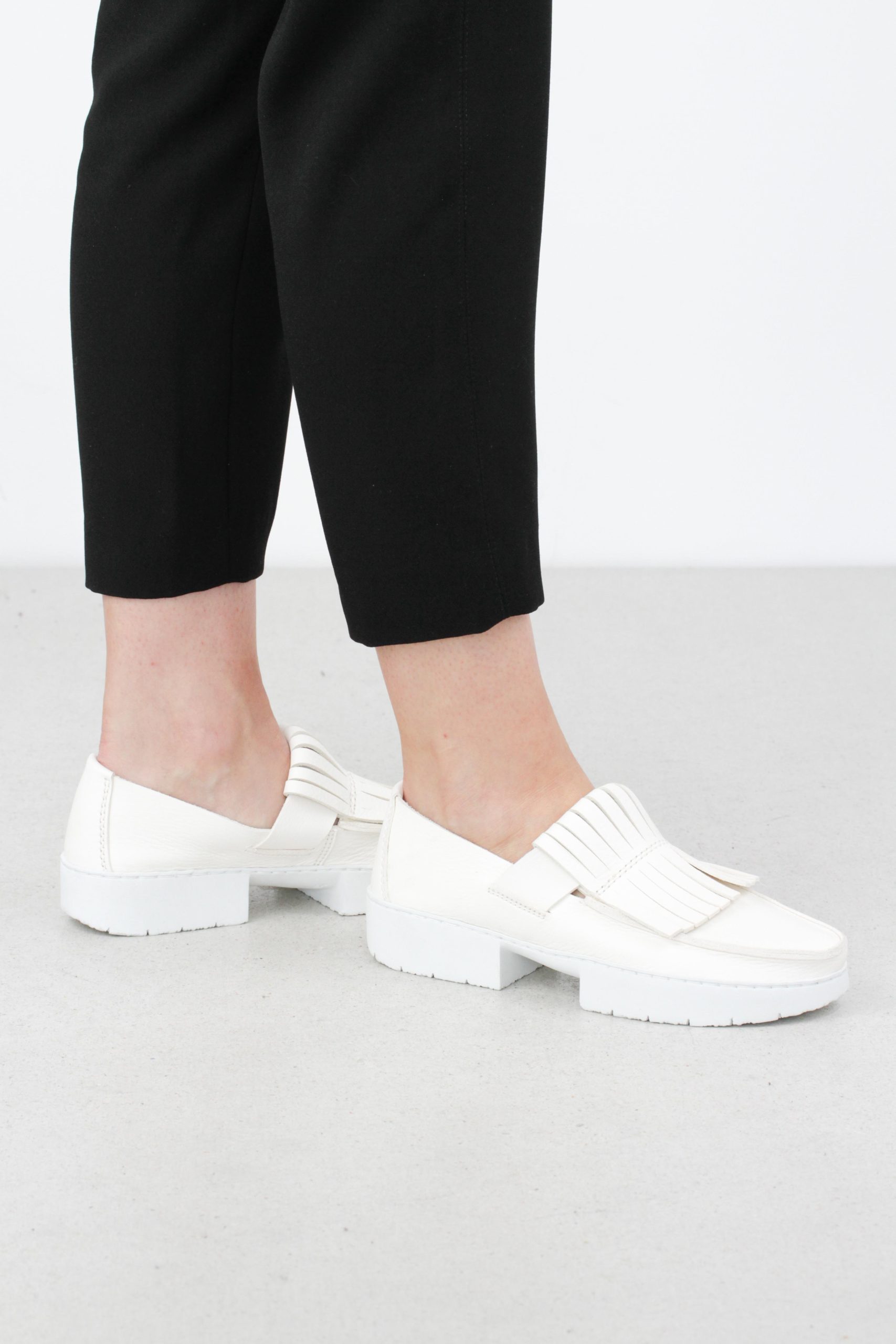 Unisex style resembling a classic loafer with a decorative fringe décor on the vamp. The raw seam around the vamp and the construction without a toe cap result in a slightly pointier shape. An elastic strap runs across the instep, neatly hidden beneath the fringe detail.