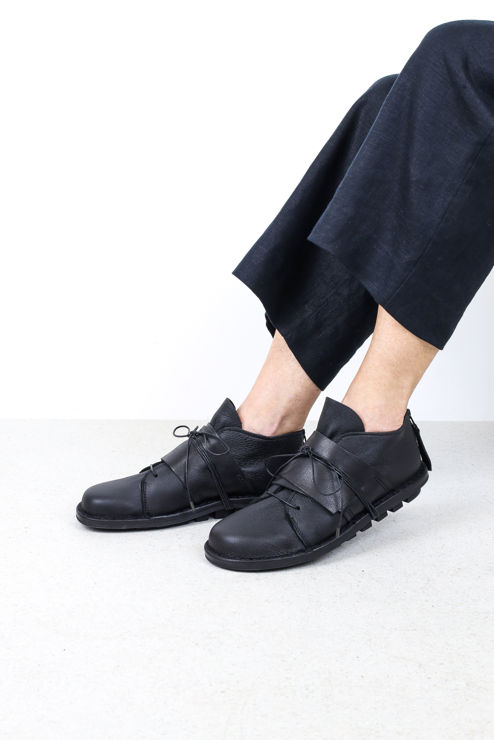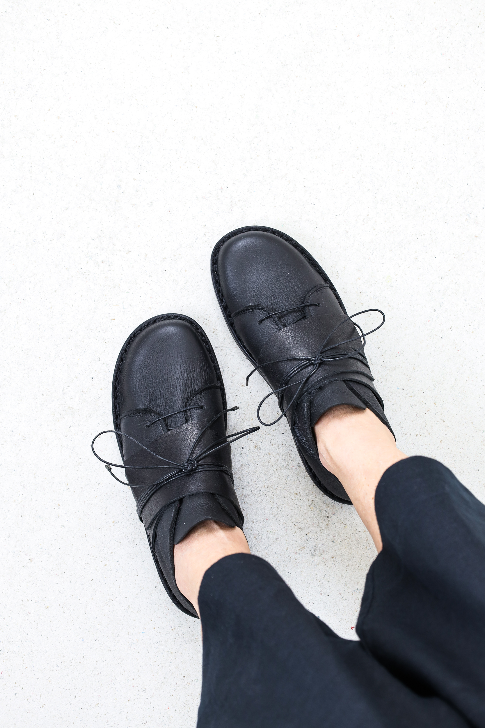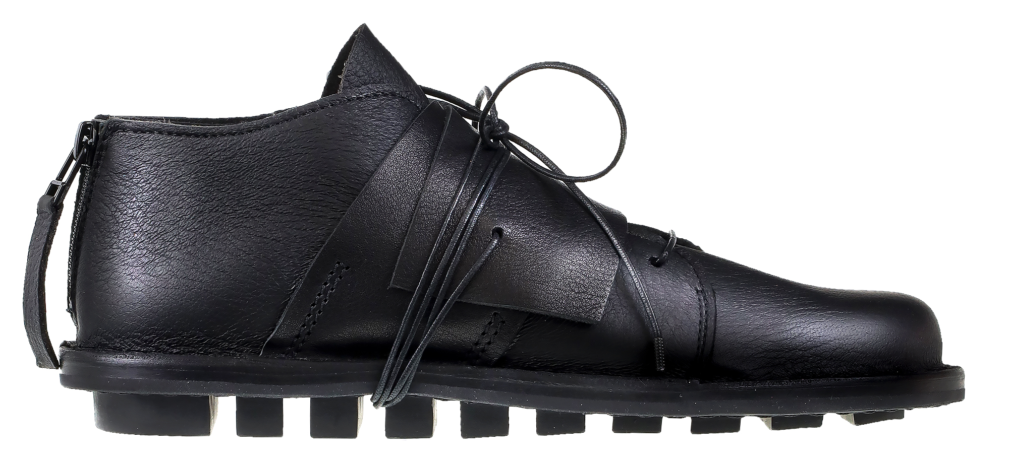 The lacing runs from top to bottom, wrapping around the leather layers over the arch and around the sole. The zipper at the back ensures an easy fit.