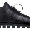 The lacing runs from top to bottom, wrapping around the leather layers over the arch and around the sole. The zipper at the back ensures an easy fit.