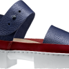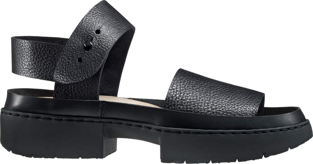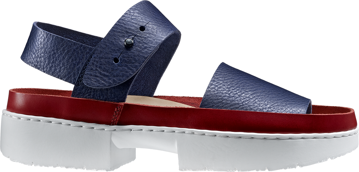 Classic, yet avant-garde unisex sandal featuring a striking wax leather border along the inner sole, two wide straps over the instep, a button fastening and a strap around the heel.