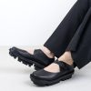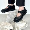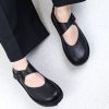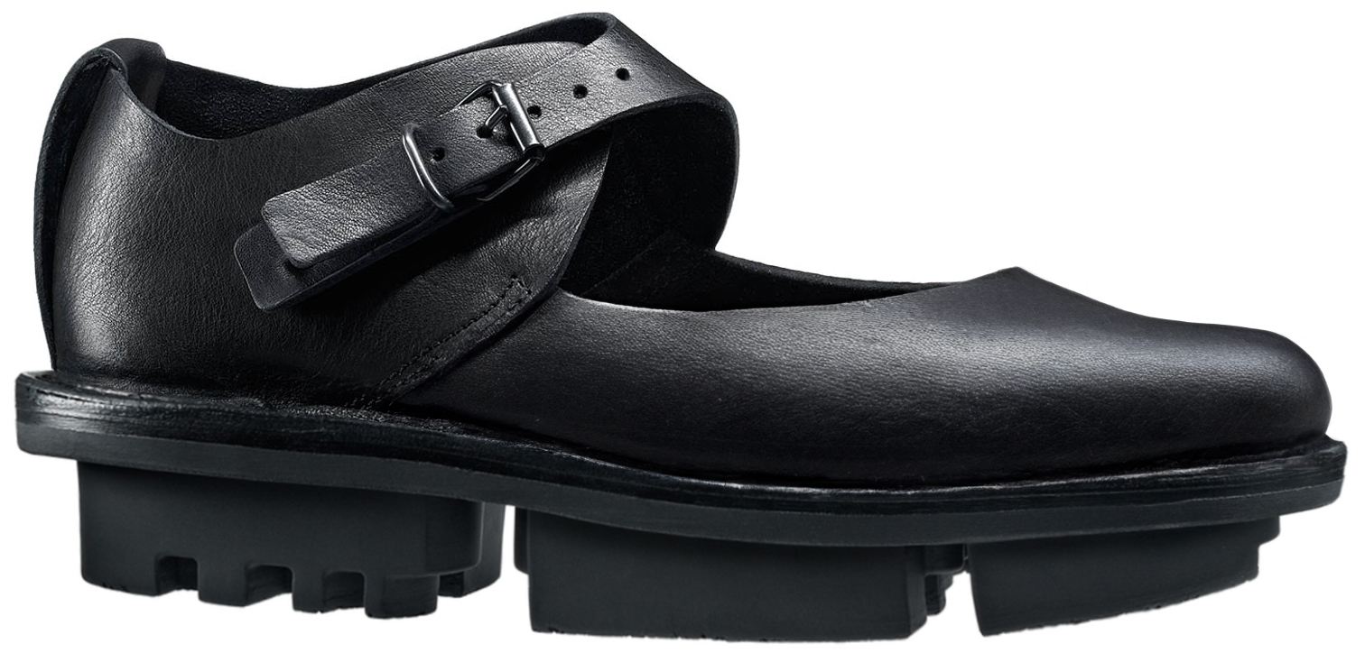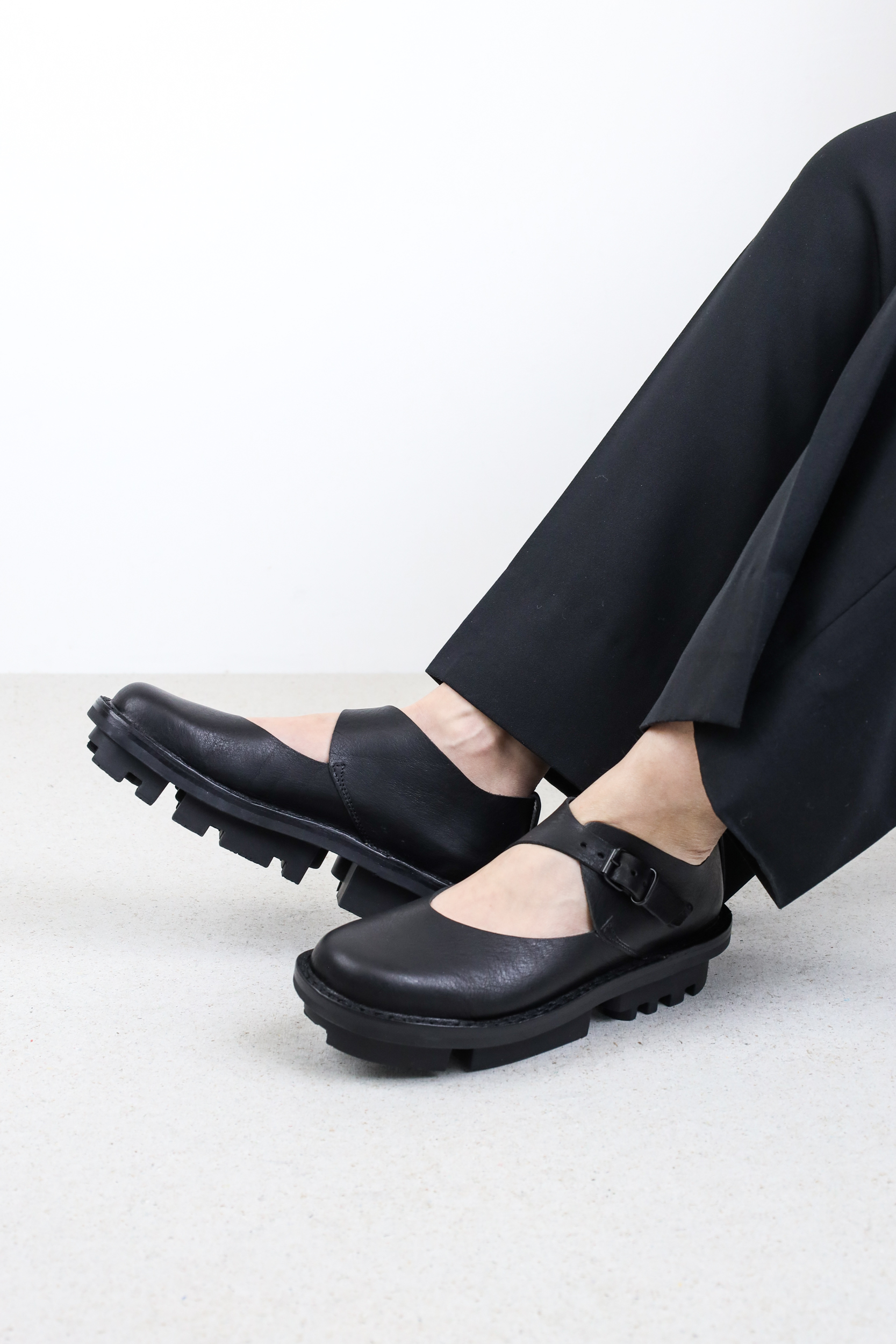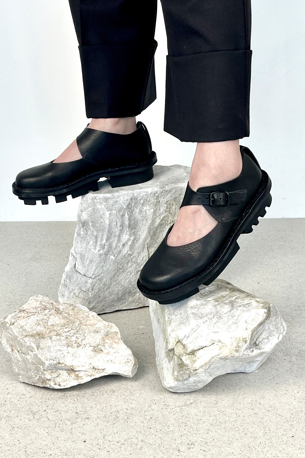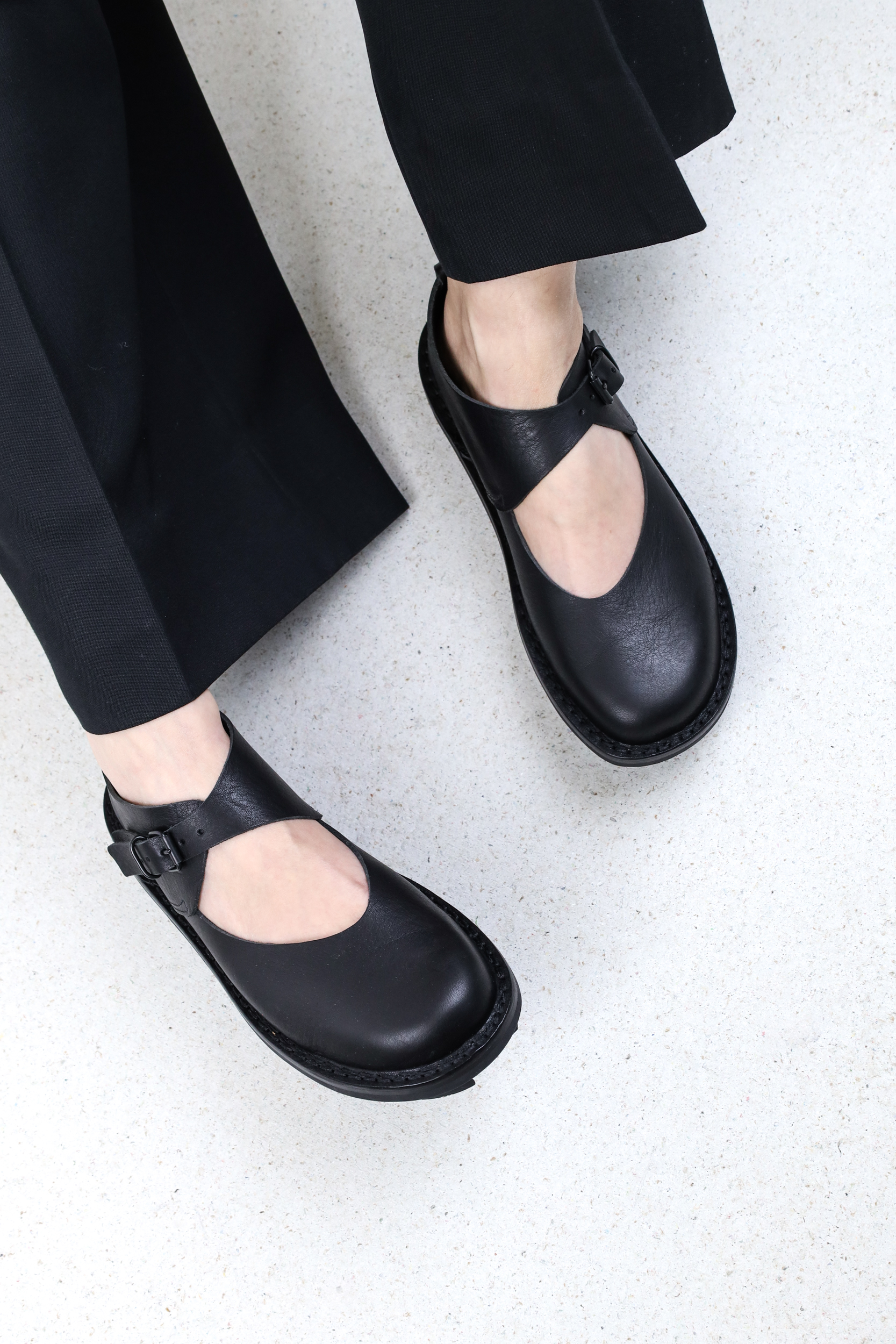 Summery low-cut shoe with lateral buckle and a combination of soft leather in front and firmer leather around the heel.