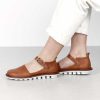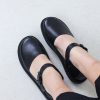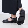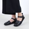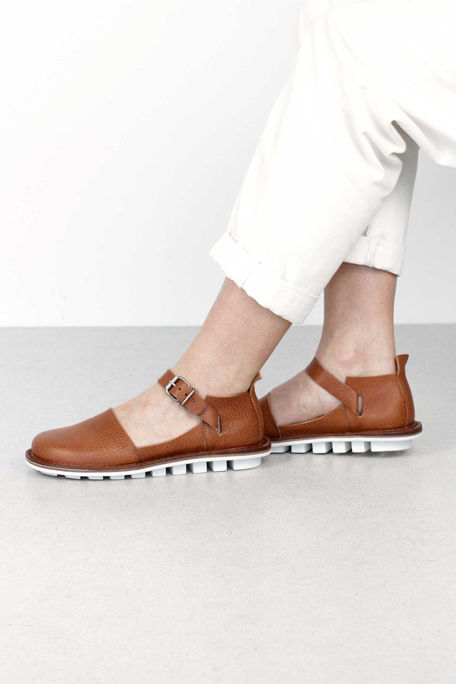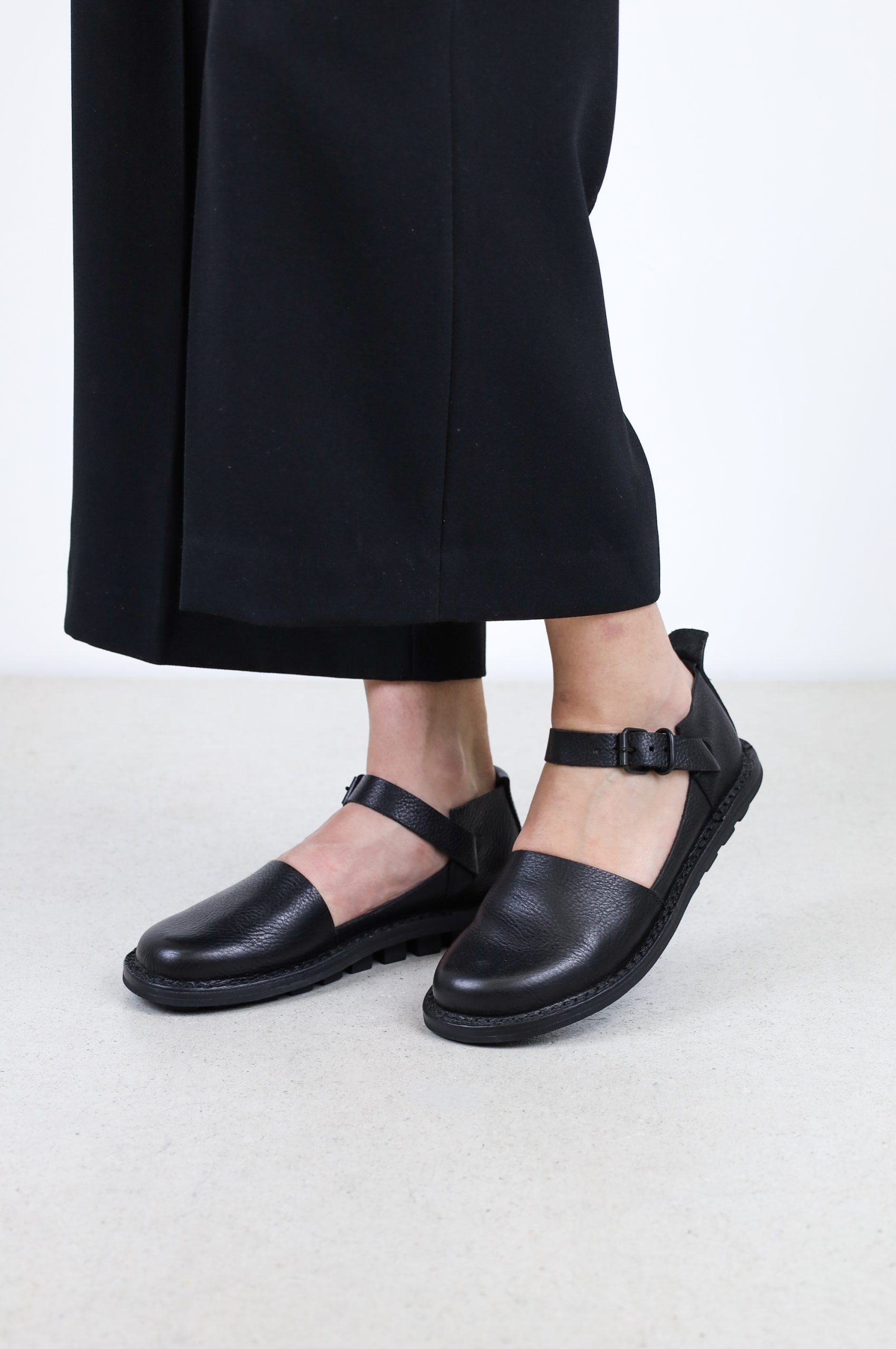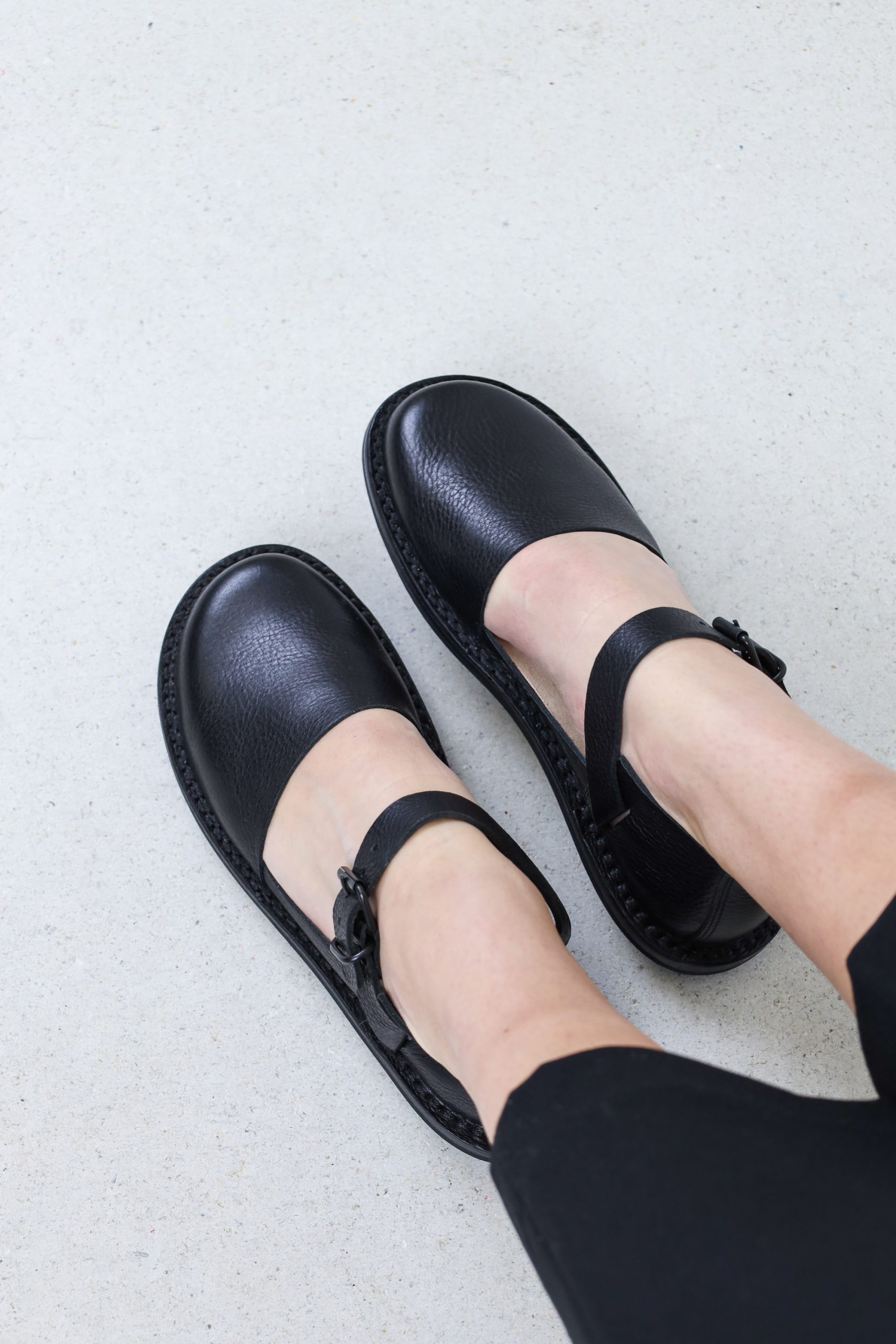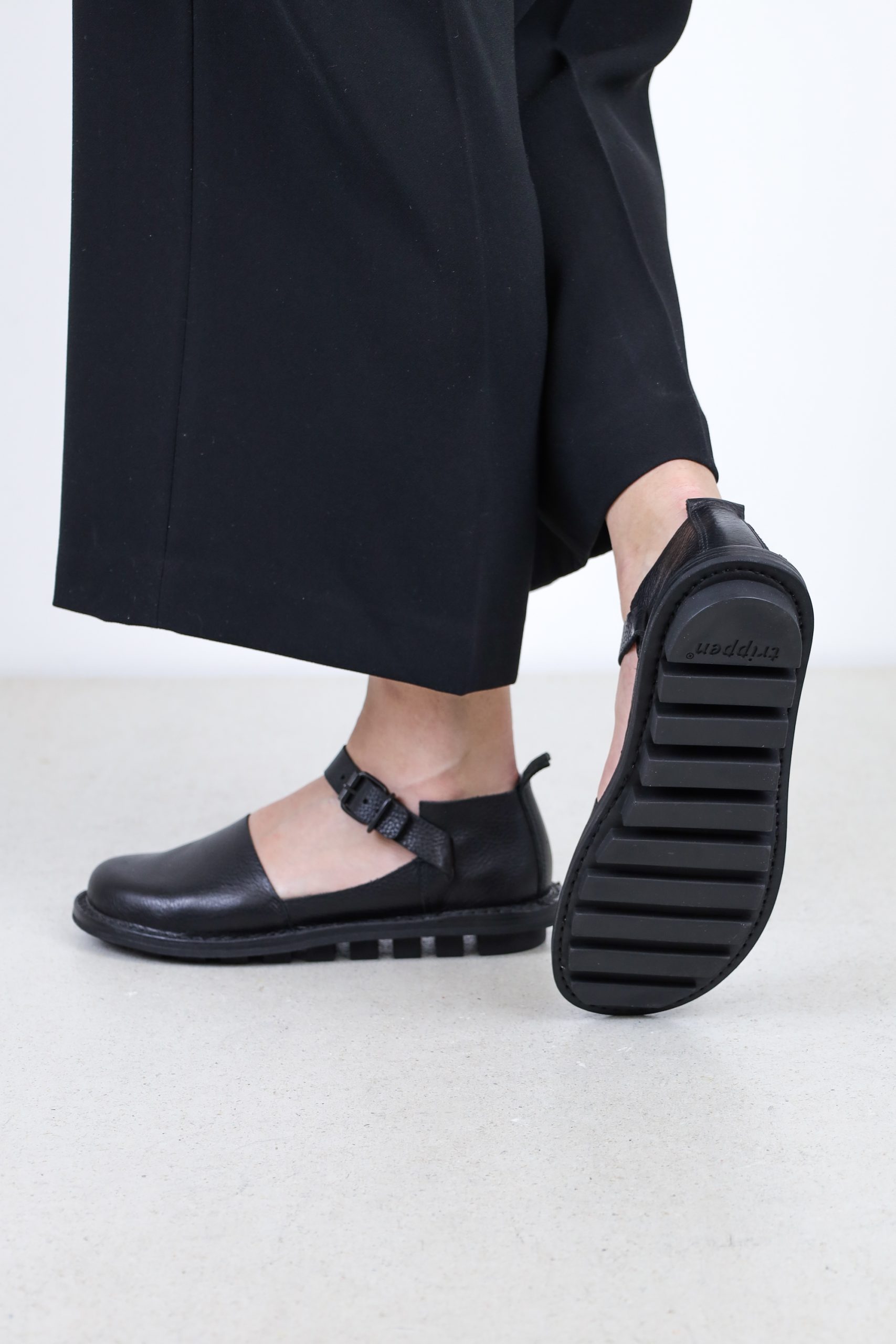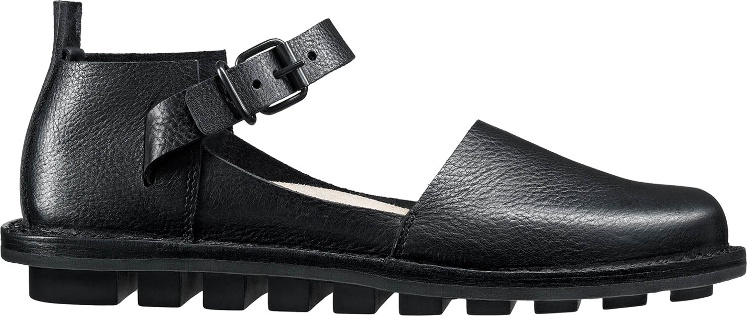 Simple, deliberately graphic unisex model with rectangular cut-out and a strap with buckle fastening leading directly from the upper over the instep.