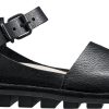 Simple, deliberately graphic unisex model with rectangular cut-out and a strap with buckle fastening leading directly from the upper over the instep.