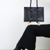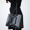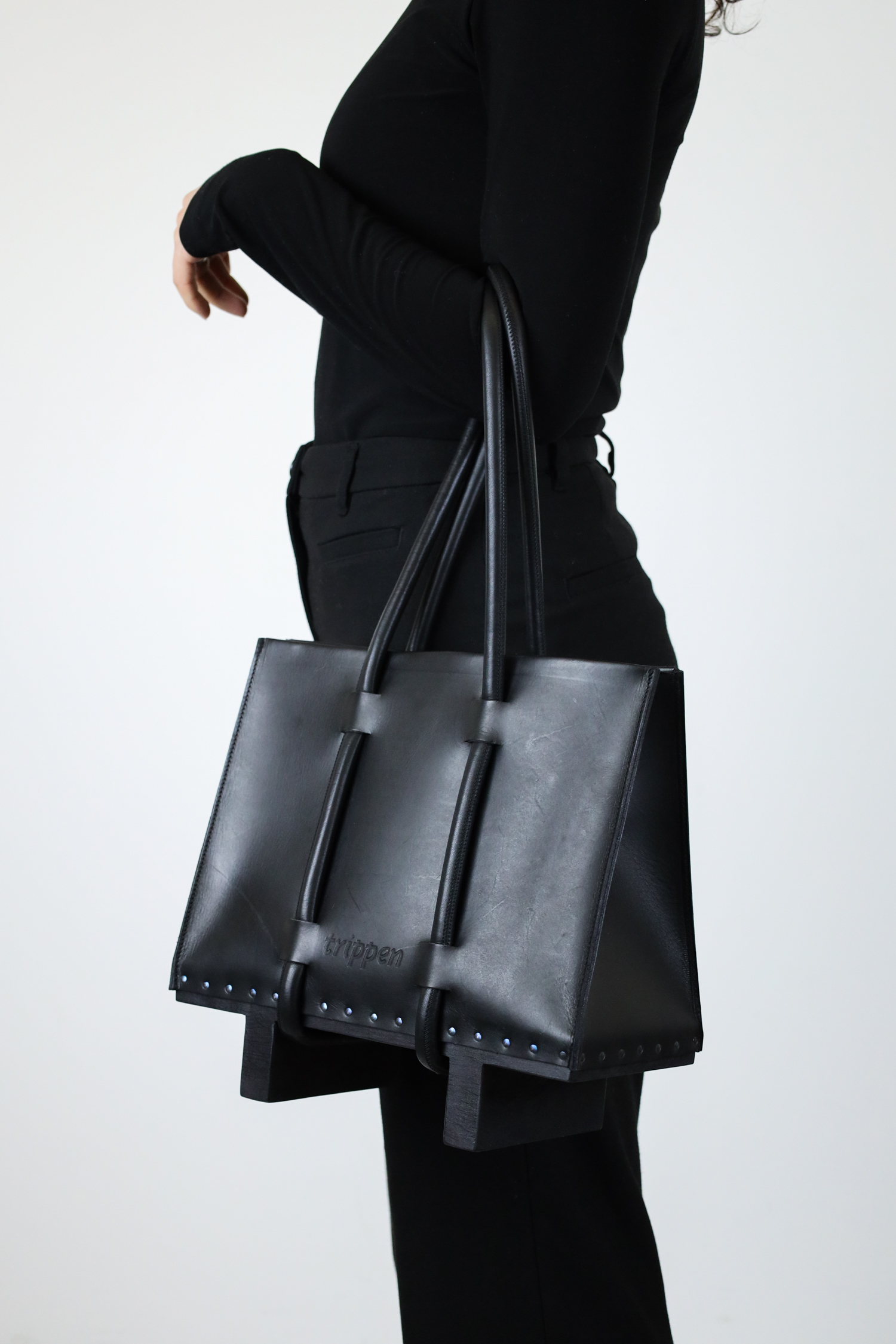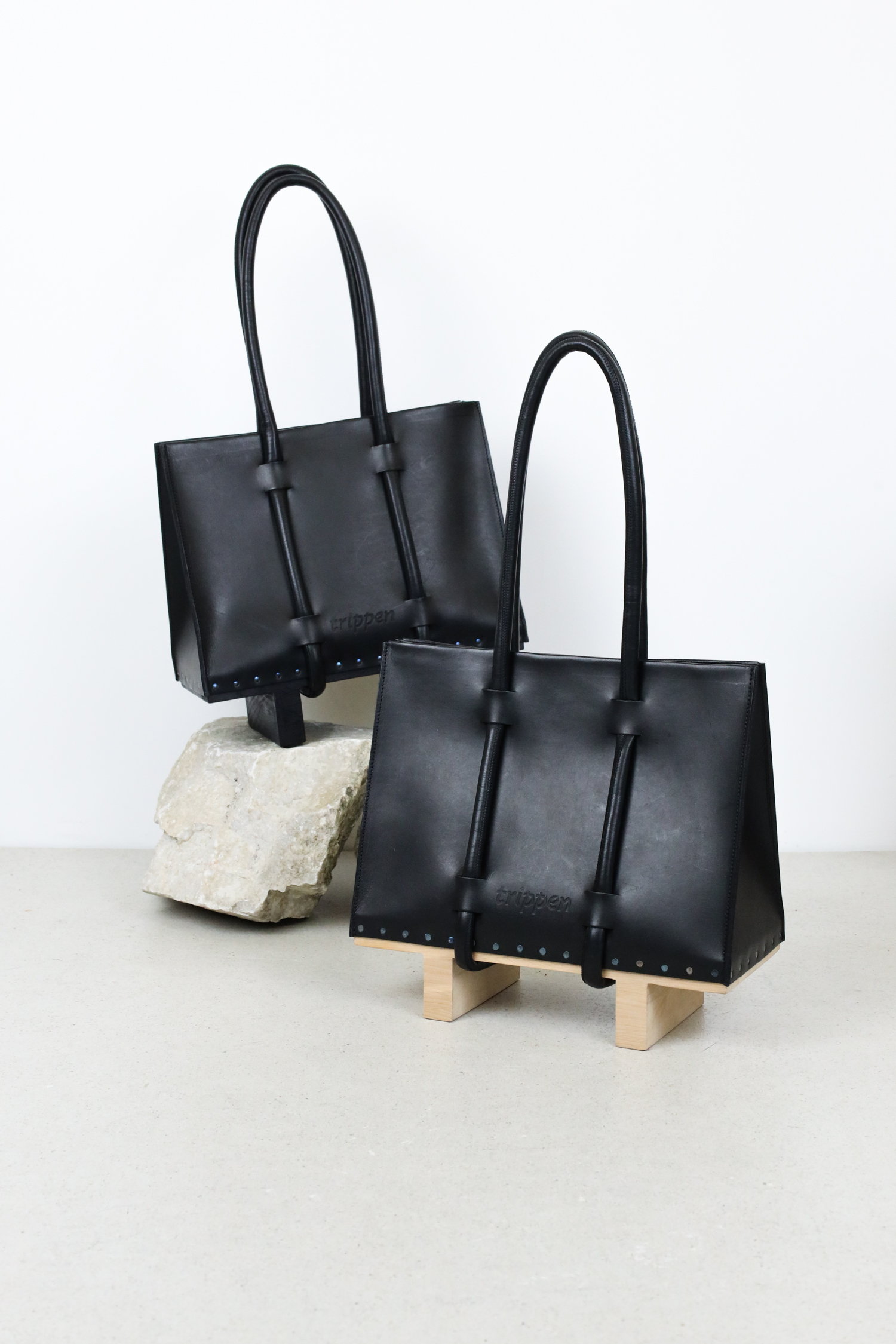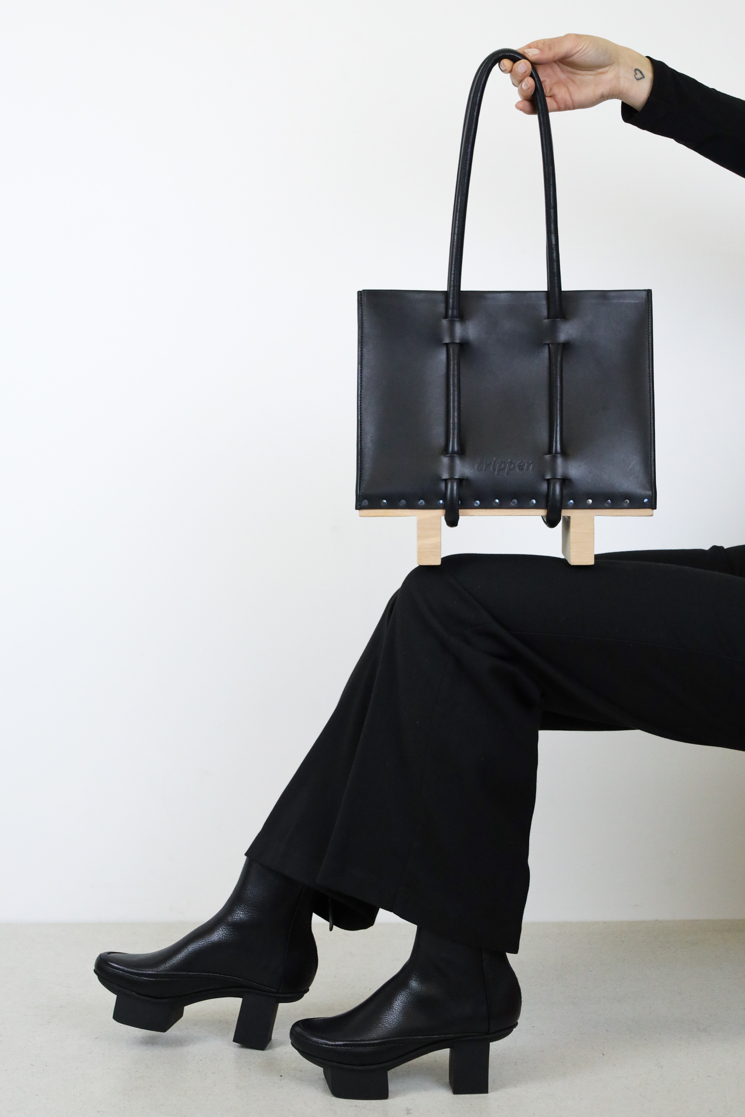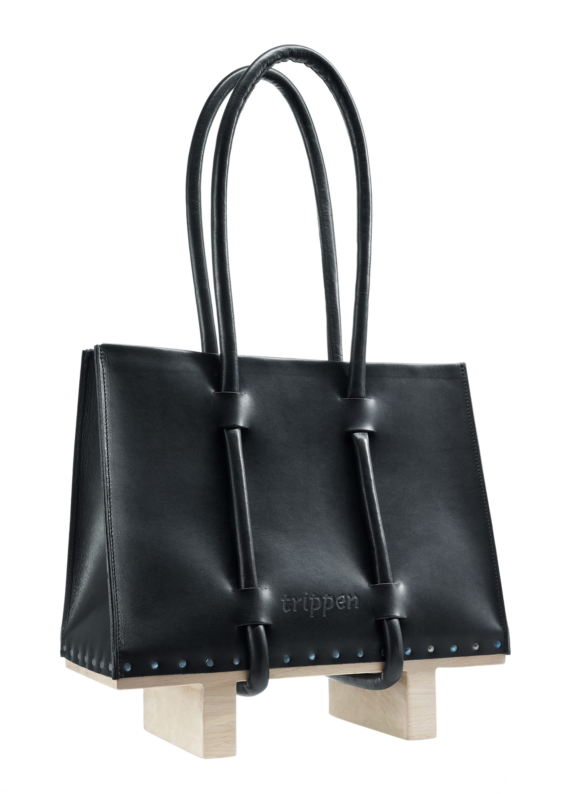 The bag is a reference to our name, trippen, signifying wooden undershoes, or pattens, that were strapped under delicate shoes in the Middle Ages to protect them. The bag and its “undershoe” are held together by thick leather straps. Two inner pockets can be closed with magnets.