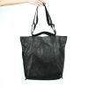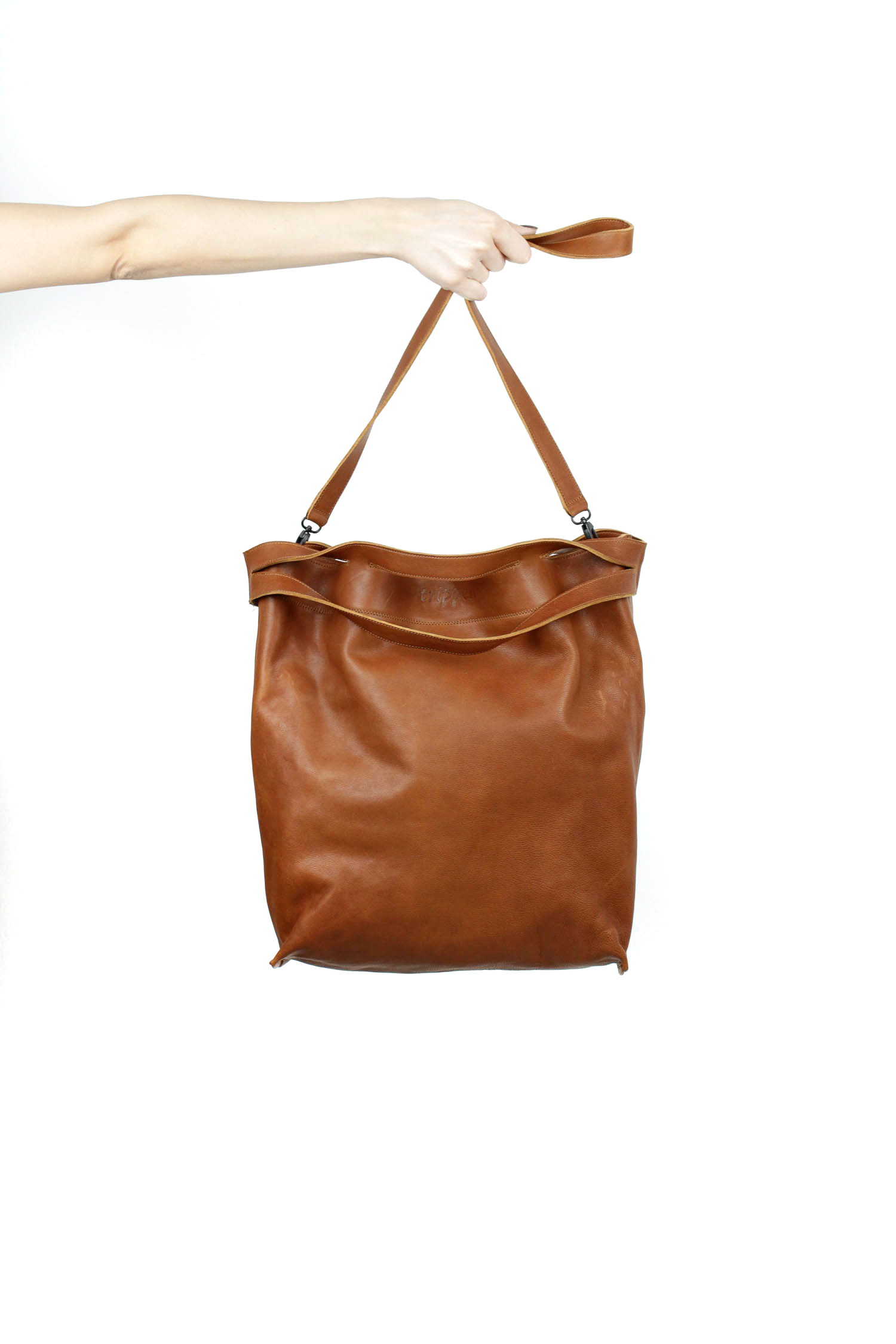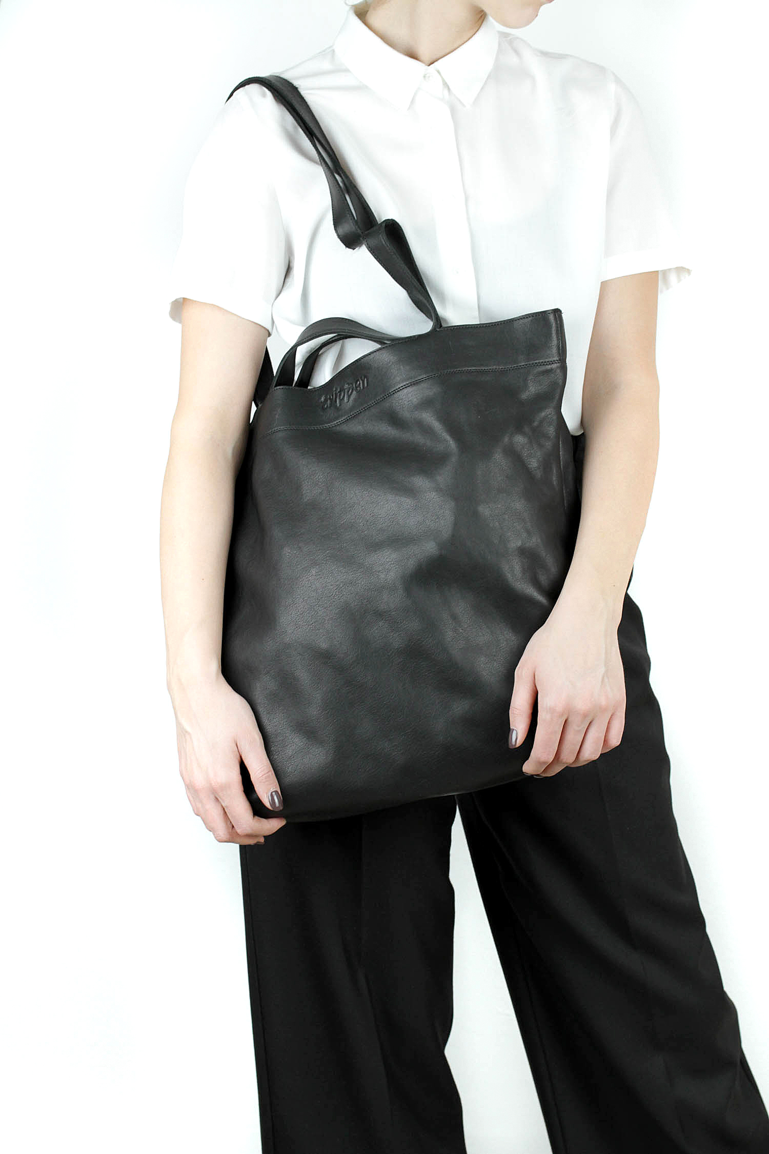 Plain, light trapezium-shaped, elaborately designed bag. Thanks to the cuts along the upper edge, the straps can be shortened when the bag is carried by hand or lengthened across the shoulder. An additional shoulder strap ensures even greater variability.